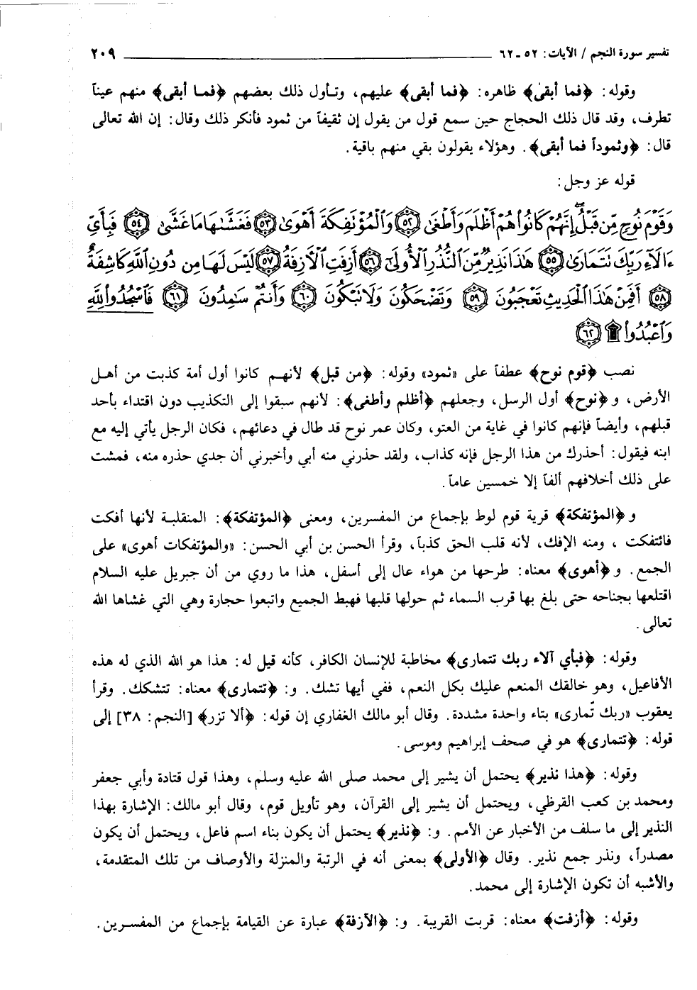 وَقَوْمَ نُوحٍ مِنْ قَبْلُ إِنَّهُمْ كانُوا هُمْ أَظْلَمَ وَأَطْغى (٥٢) وَالْمُؤْتَفِكَةَ أَهْوى (٥٣) فَغَشَّاها ما غَشَّى (٥٤) فَبِأَيِّ آلاءِ رَبِّكَ تَتَمارى (٥٥) هذا نَذِيرٌ مِنَ النُّذُرِ الْأُولى (٥٦)
