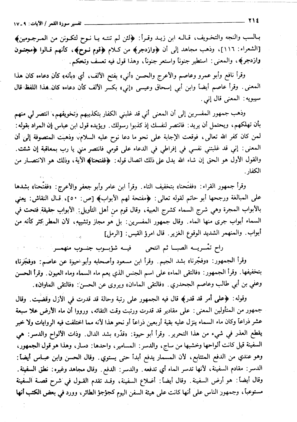 وقرأ جمهور القراء: «ففتحنا» بتخفيف التاء. وقرأ ابن عامر وأبو جعفر والأعرج: «ففتّحنا» بشدها على المبالغة ورجحها أبو حاتم لقوله تعالى: مُفَتَّحَةً لَهُمُ الْأَبْوابُ [ص: ٥٠] ، قال النقاش: يعني بالأبواب المجرة وهي شرج السماء كشرج العبية، وقال قوم من أهل التأويل: الأبواب حقيقة فتحت في السماء أبواب جرى منها الماء. وقال جمهور المفسرين: بل هو مجاز وتشبيه، لأن المطر كثر كأنه من أبواب. والمنهمر الشديد الوقوع الغزير. قال امرؤ القيس: [الرمل]
