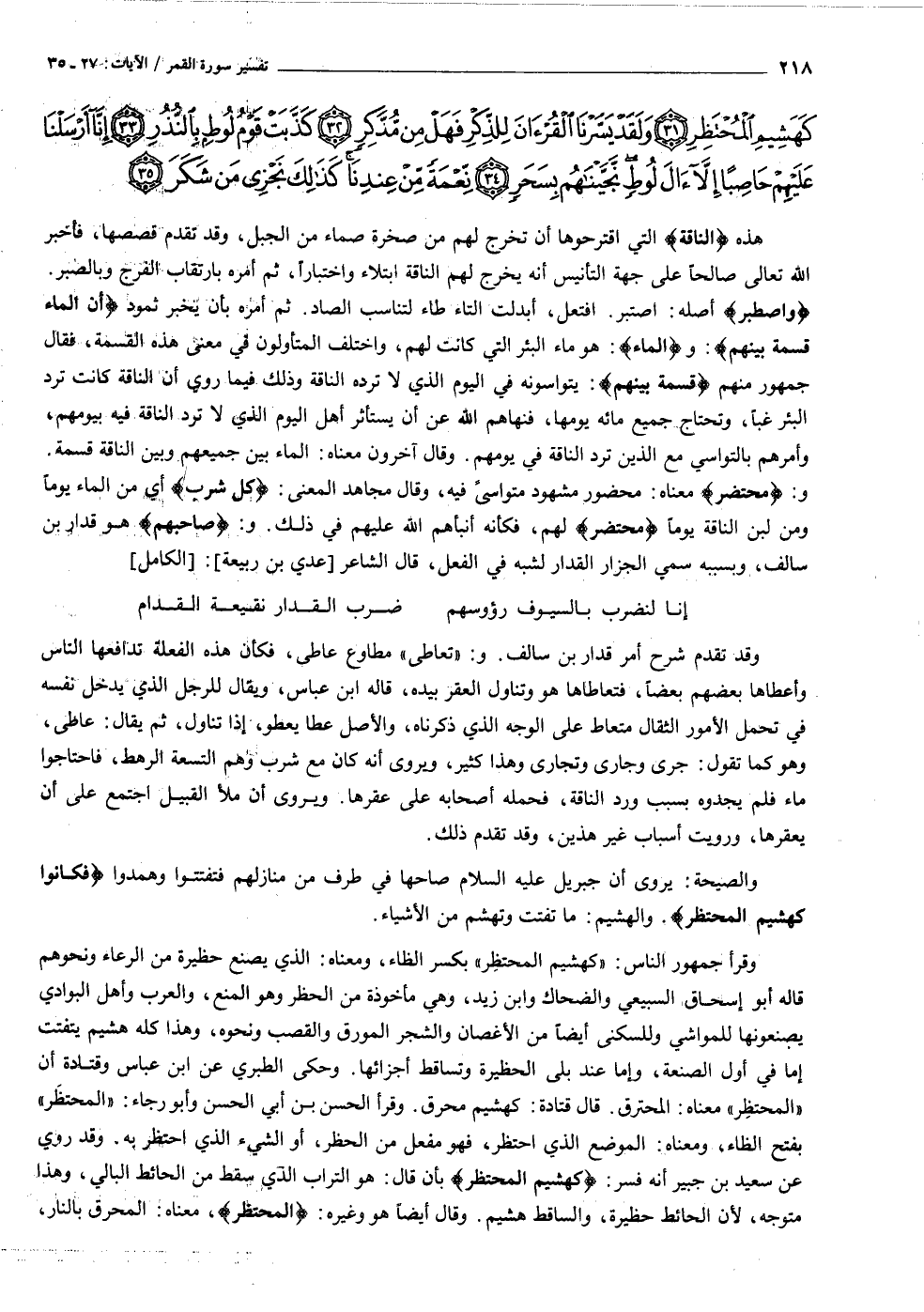 و: مُحْتَضَرٌ معناه: محضور مشهود متواسى فيه، وقال مجاهد المعنى: كُلُّ شِرْبٍ أي من الماء يوما ومن لبن الناقة يوما مُحْتَضَرٌ لهم، فكأنه أنبأهم الله عليهم في ذلك. و: صاحِبَهُمْ هو قدار بن سالف، وبسببه سمي الجزار القدار لشبه في الفعل، قال الشاعر [عدي بن ربيعة] : [الكامل]