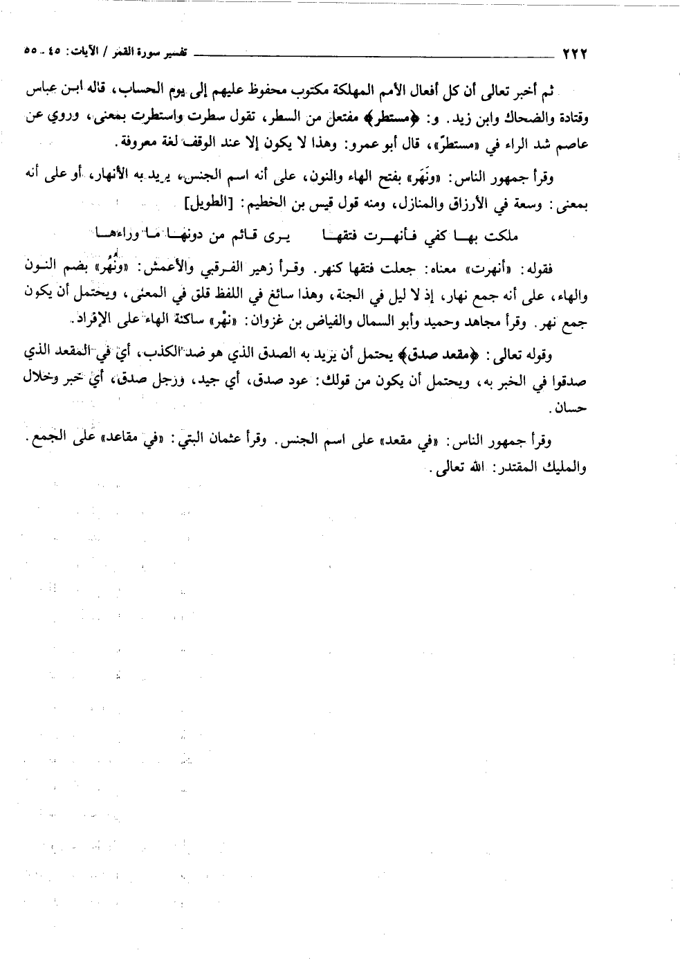 وقوله تعالى: مَقْعَدِ صِدْقٍ يحتمل أن يريد به الصدق الذي هو ضد الكذب، أي في المقعد الذي صدقوا في الخبر به، ويحتمل أن يكون من قولك: عود صدق، أي جيد، ورجل صدق، أي خبر وخلال حسان.