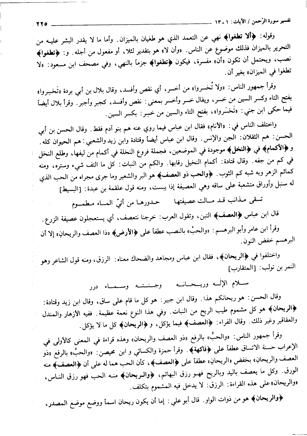 وقوله: أَلَّا تَطْغَوْا نهي عن التعمد الذي هو طغيان بالميزان. وأما ما لا يقدر البشر عليه من التحرير بالميزان فذلك موضوع عن الناس. «وأن لا» هو بتقدير لئلا، أو مفعول من أجله. و: تَطْغَوْا نصب، ويحتمل أن تكون «أن» مفسرة، فيكون تَطْغَوْا جزما بالنهي، وفي مصحف ابن مسعود: «لا تطغوا في الميزان» بغير أن.