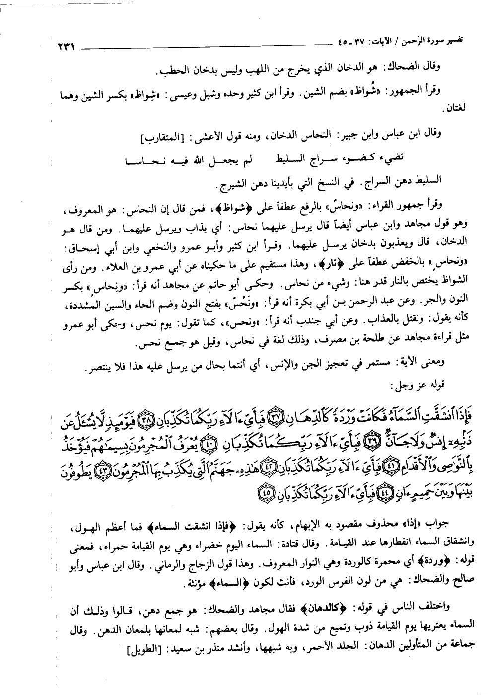 فَإِذَا انْشَقَّتِ السَّماءُ فَكانَتْ وَرْدَةً كَالدِّهانِ (٣٧) فَبِأَيِّ آلاءِ رَبِّكُما تُكَذِّبانِ (٣٨) فَيَوْمَئِذٍ لا يُسْئَلُ عَنْ ذَنْبِهِ إِنْسٌ وَلا جَانٌّ (٣٩) فَبِأَيِّ آلاءِ رَبِّكُما تُكَذِّبانِ (٤٠) يُعْرَفُ الْمُجْرِمُونَ بِسِيماهُمْ فَيُؤْخَذُ بِالنَّواصِي وَالْأَقْدامِ (٤١)