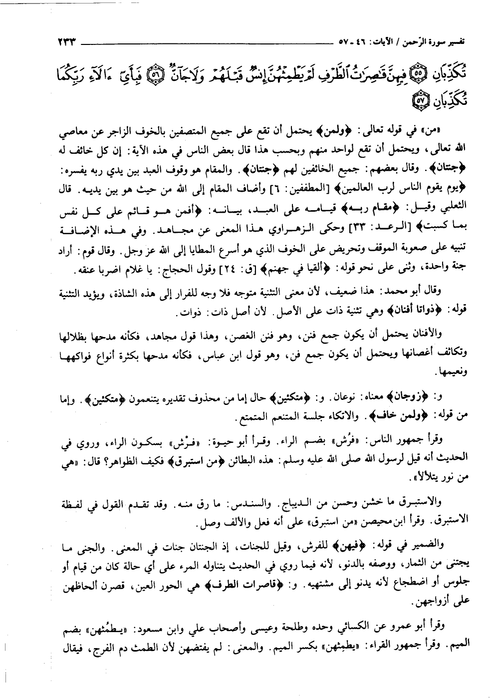 «من» في قوله تعالى: وَلِمَنْ يحتمل أن تقع على جميع المتصفين بالخوف الزاجر عن معاصي الله تعالى، ويحتمل أن تقع لواحد منهم وبحسب هذا قال بعض الناس في هذه الآية: إن كل خائف له جَنَّتانِ. وقال بعضهم: جميع الخائفين لهم جَنَّتانِ. والمقام هو وقوف العبد بين يدي ربه يفسره: