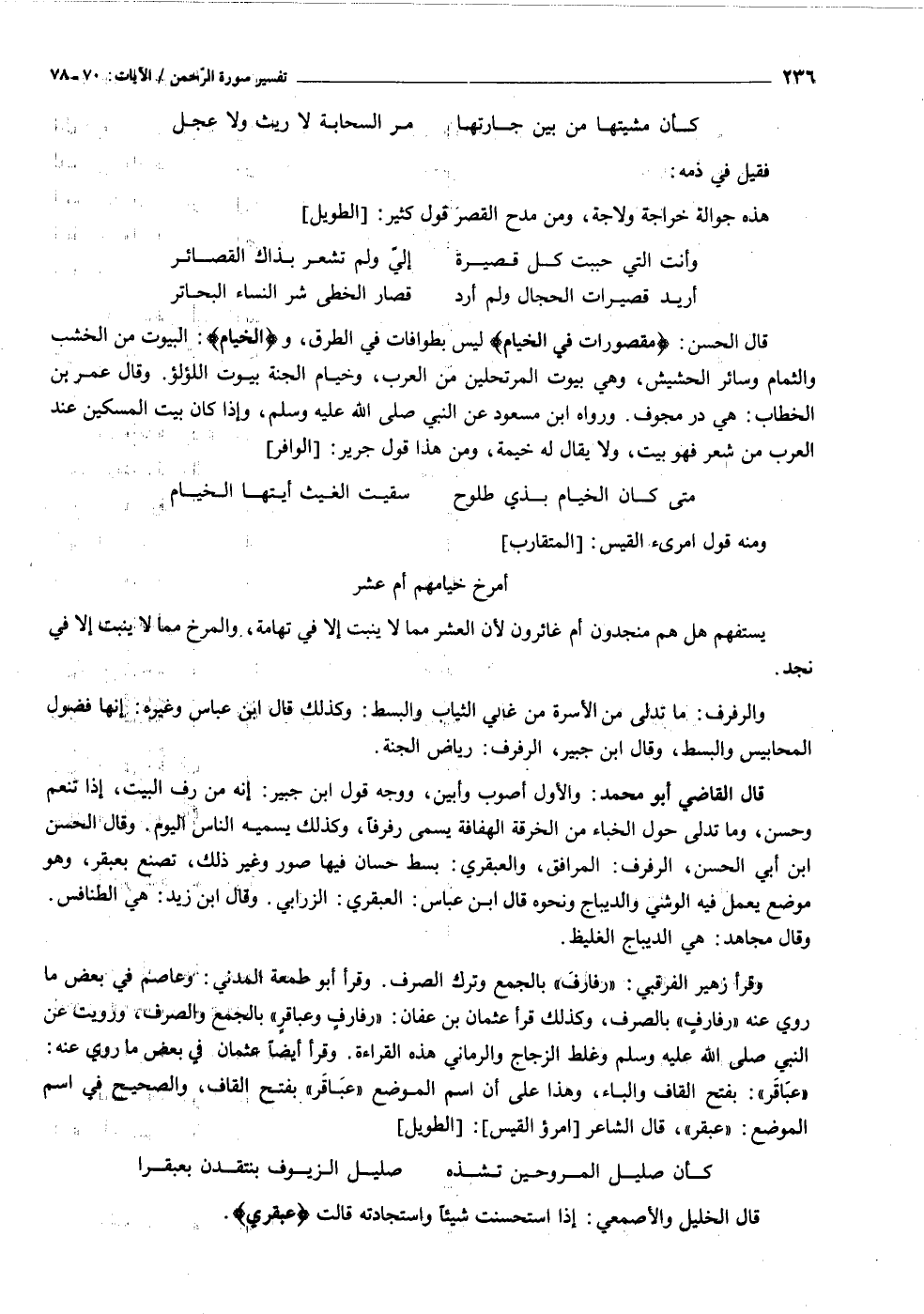 قال القاضي أبو محمد: والأول أصوب وأبين، ووجه قول ابن جبير: إنه من رف البيت، إذا تنعم وحسن، وما تدلى حول الخباء من الخرقة الهفافة يسمى رفرفا، وكذلك يسميه الناس اليوم. وقال الحسن ابن أبي الحسن، الرفرف: المرافق، والعبقري: بسط حسان فيها صور وغير ذلك، تصنع بعبقر، وهو موضع يعمل فيه الوشي والديباج ونحوه قال ابن عباس: العبقري: الزرابي. وقال ابن زيد: هي الطنافس.