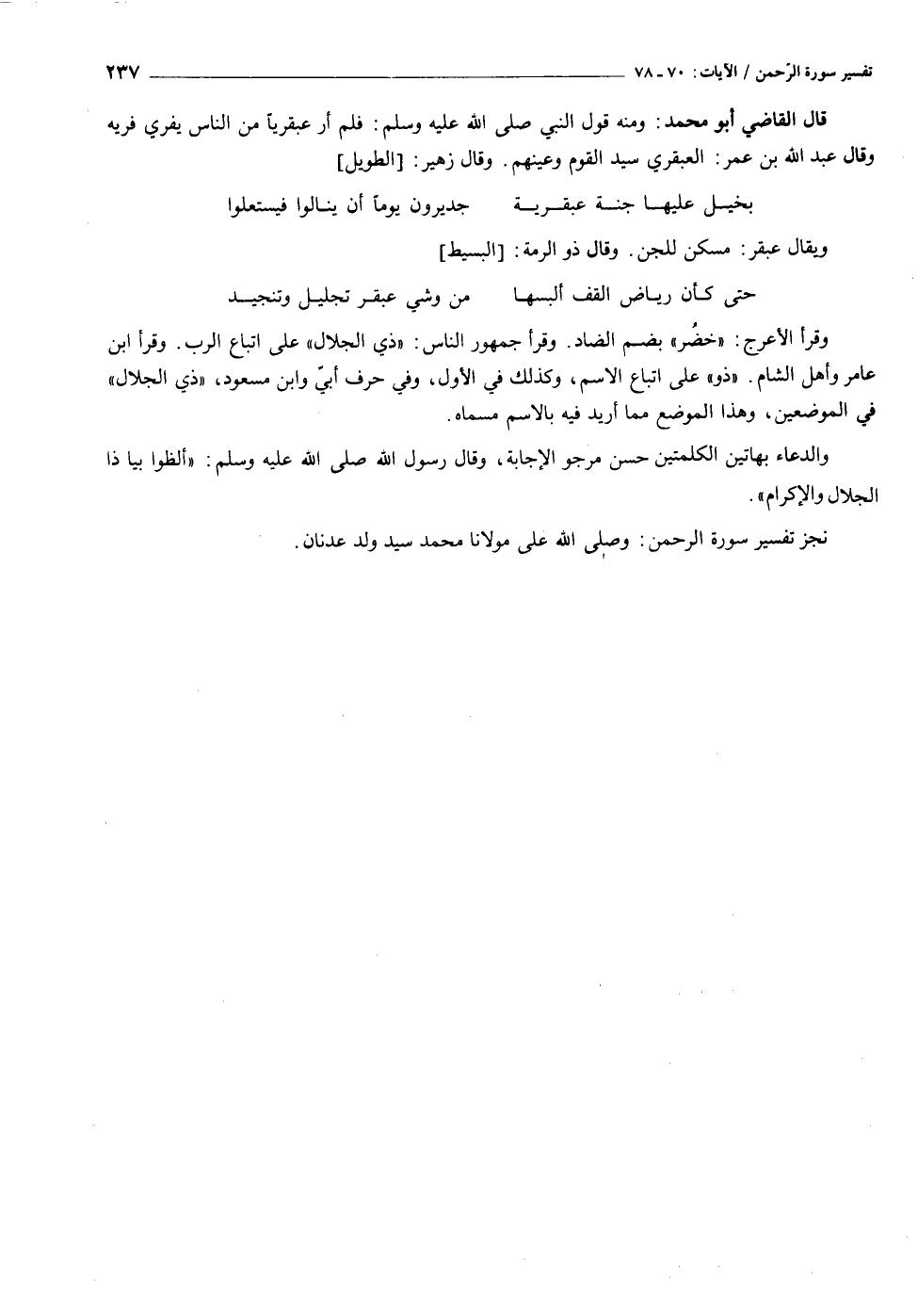نجز تفسير سورة الرحمن: وصلى الله على مولانا محمد سيد ولد عدنان.