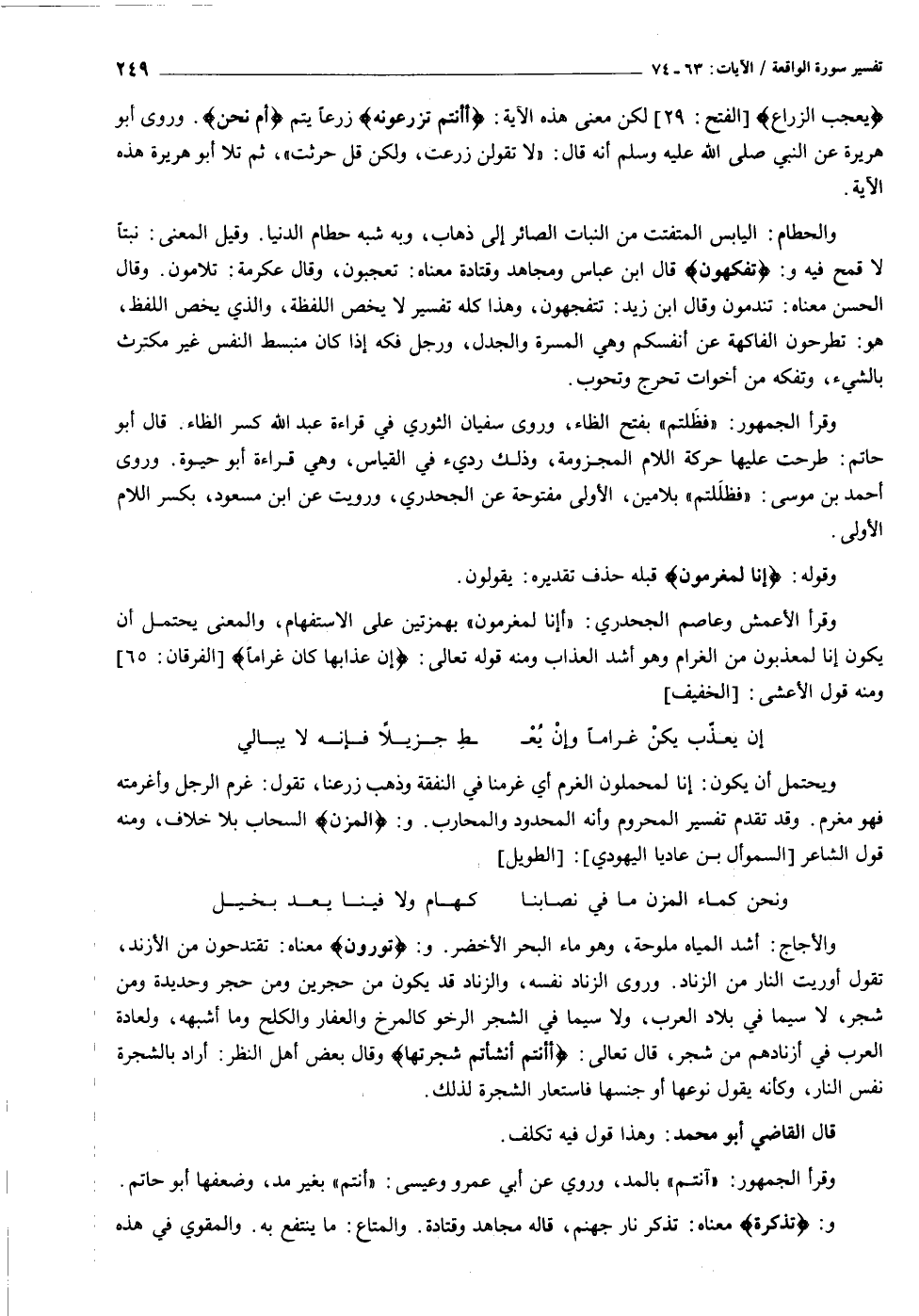 ويحتمل أن يكون: إنا لمحملون الغرم أي غرمنا في النفقة وذهب زرعنا، تقول: غرم الرجل وأغرمته فهو مغرم. وقد تقدم تفسير المحروم وأنه المحدود والمحارب. و: الْمُزْنِ السحاب بلا خلاف، ومنه قول الشاعر [السموأل بن عاديا اليهودي] : [الطويل]