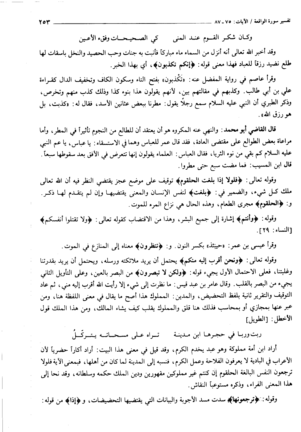 أراد ابن أمة مملوكة وهو عبد يخدم الكرم، وقد قيل في معنى هذا البيت: أراد أكارا حضريا لأن الأعراب في البادية لا يعرفون الفلاحة وعمل الكرم، فنسبه إلى المدينة لما كان من أهلها، فبمعنى الآية فلولا ترجعون النفس البالغة الحلقوم إن كنتم غير مملوكين مقهورين ودين الملك حكمه وسلطانه، وقد نحا إلى هذا المعنى الفراء، وذكره مستوعبا النقاش.