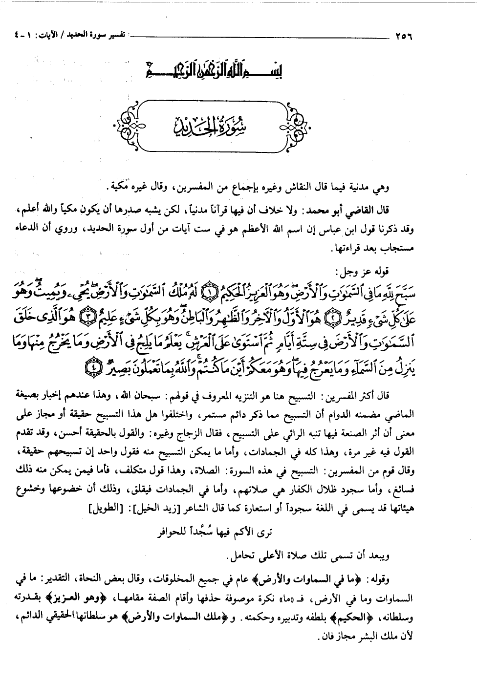 سَبَّحَ لِلَّهِ ما فِي السَّماواتِ وَالْأَرْضِ وَهُوَ الْعَزِيزُ الْحَكِيمُ (١) لَهُ مُلْكُ السَّماواتِ وَالْأَرْضِ يُحْيِي وَيُمِيتُ وَهُوَ عَلى كُلِّ شَيْءٍ قَدِيرٌ (٢) هُوَ الْأَوَّلُ وَالْآخِرُ وَالظَّاهِرُ وَالْباطِنُ وَهُوَ بِكُلِّ شَيْءٍ عَلِيمٌ (٣) هُوَ الَّذِي خَلَقَ السَّماواتِ وَالْأَرْضَ فِي سِتَّةِ أَيَّامٍ ثُمَّ اسْتَوى عَلَى الْعَرْشِ يَعْلَمُ ما يَلِجُ فِي الْأَرْضِ وَما يَخْرُجُ مِنْها وَما يَنْزِلُ مِنَ السَّماءِ وَما يَعْرُجُ فِيها وَهُوَ مَعَكُمْ أَيْنَ ما كُنْتُمْ وَاللَّهُ بِما تَعْمَلُونَ بَصِيرٌ (٤)