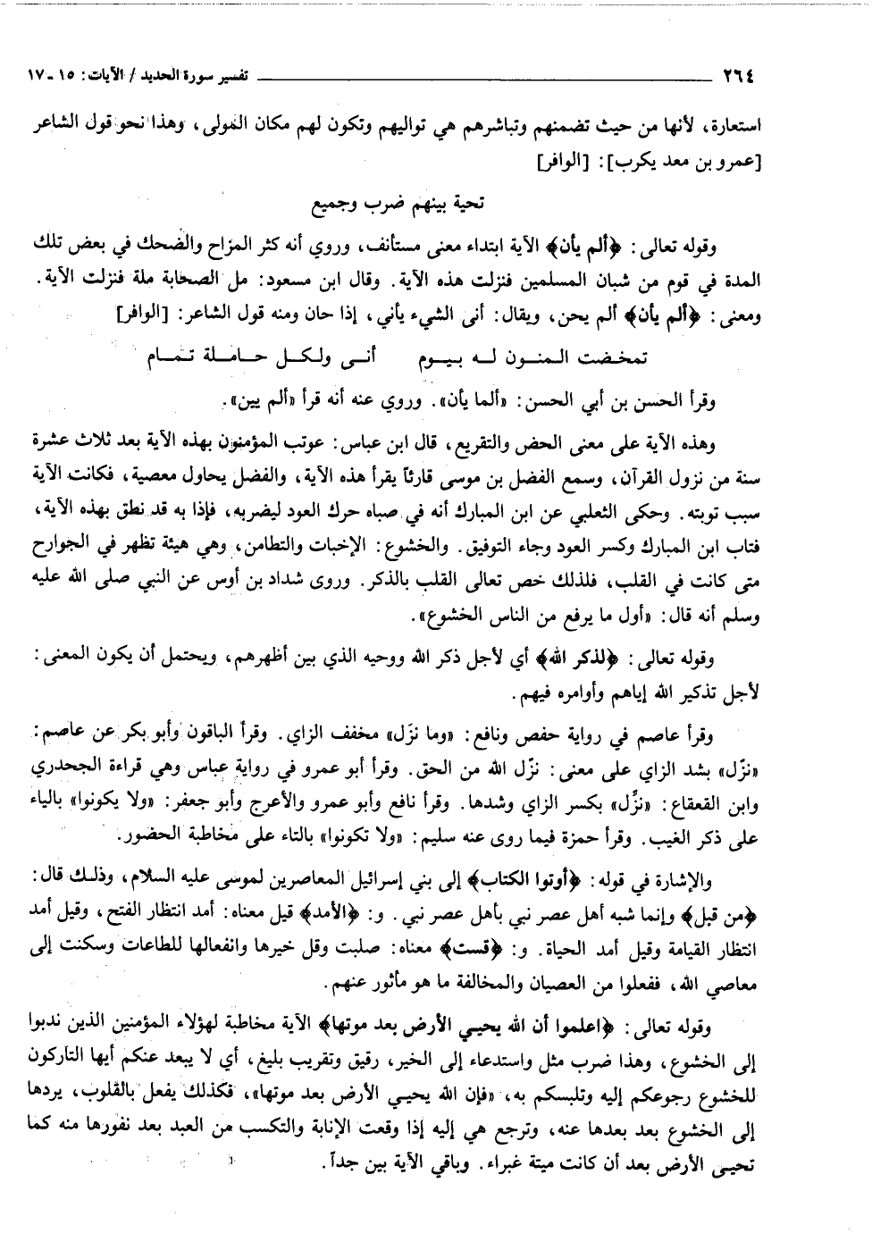 استعارة، لأنها من حيث تضمنهم وتباشرهم هي تواليهم وتكون لهم مكان المولى، وهذا نحو قول الشاعر [عمرو بن معد يكرب] : [الوافر] تحية بينهم ضرب وجميع وقوله تعالى: أَلَمْ يَأْنِ الآية ابتداء معنى مستأنف، وروي أنه كثر المزاح والضحك في بعض تلك المدة في قوم من شبان المسلمين فنزلت هذه الآية. وقال ابن مسعود: مل الصحابة ملة فنزلت الآية.