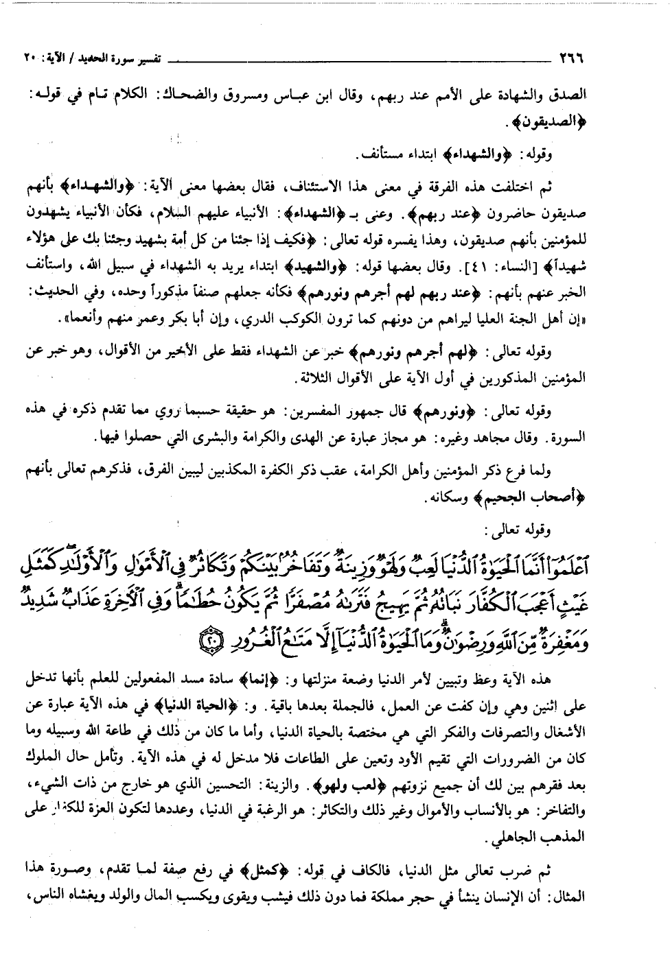 هذه الآية وعظ وتبيين لأمر الدنيا وضعة منزلتها و: أَنَّمَا سادة مسد المفعولين للعلم بأنها تدخل على اثنين وهي وإن كفت عن العمل، فالجملة بعدها باقية. و: الْحَياةُ الدُّنْيا في هذه الآية عبارة عن الأشغال والتصرفات والفكر التي هي مختصة بالحياة الدنيا، وأما ما كان من ذلك في طاعة الله وسبيله وما كان من الضرورات التي تقيم الأود وتعين على الطاعات فلا مدخل له في هذه الآية. وتأمل حال الملوك بعد فقرهم بين لك أن جميع نزوتهم لَعِبٌ وَلَهْوٌ. والزينة: التحسين الذي هو خارج من ذات الشيء، والتفاخر: هو بالأنساب والأموال وغير ذلك والتكاثر: هو الرغبة في الدنيا، وعددها لتكون العزة للكفار على المذهب الجاهلي.
