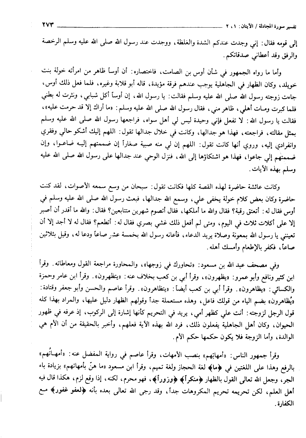 وفي مصحف عبد الله بن مسعود: «تحاورك في زوجها» ، والمحاورة مراجعة القول ومعاطاته. وقرأ ابن كثير ونافع وأبو عمرو: «يظهرون» ، وقرأ أبي بن كعب بخلاف عنه: «يتظهرون» . وقرأ ابن عامر وحمزة والكسائي: «يظاهرون» . وقرأ أبي بن كعب أيضا: «يتظاهرون» . وقرأ عاصم والحسن وأبو جعفر وقتادة: