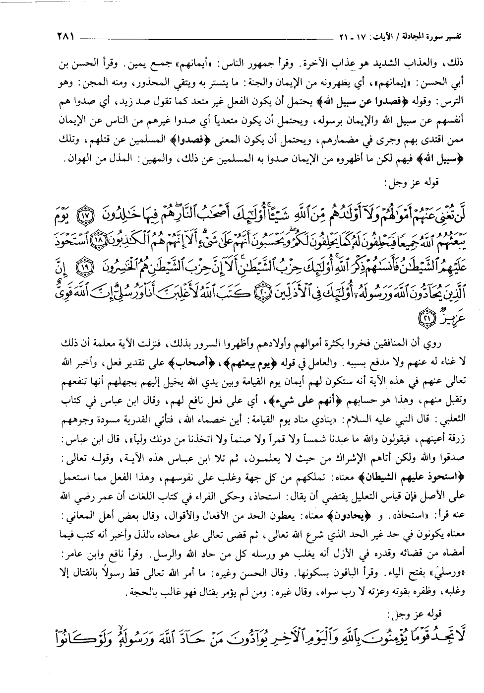 لَنْ تُغْنِيَ عَنْهُمْ أَمْوالُهُمْ وَلا أَوْلادُهُمْ مِنَ اللَّهِ شَيْئاً أُولئِكَ أَصْحابُ النَّارِ هُمْ فِيها خالِدُونَ (١٧) يَوْمَ يَبْعَثُهُمُ اللَّهُ جَمِيعاً فَيَحْلِفُونَ لَهُ كَما يَحْلِفُونَ لَكُمْ وَيَحْسَبُونَ أَنَّهُمْ عَلى شَيْءٍ أَلا إِنَّهُمْ هُمُ الْكاذِبُونَ (١٨) اسْتَحْوَذَ عَلَيْهِمُ الشَّيْطانُ فَأَنْساهُمْ ذِكْرَ اللَّهِ أُولئِكَ حِزْبُ الشَّيْطانِ أَلا إِنَّ حِزْبَ الشَّيْطانِ هُمُ الْخاسِرُونَ (١٩) إِنَّ الَّذِينَ يُحَادُّونَ اللَّهَ وَرَسُولَهُ أُولئِكَ فِي الْأَذَلِّينَ (٢٠) كَتَبَ اللَّهُ لَأَغْلِبَنَّ أَنَا وَرُسُلِي إِنَّ اللَّهَ قَوِيٌّ عَزِيزٌ (٢١)