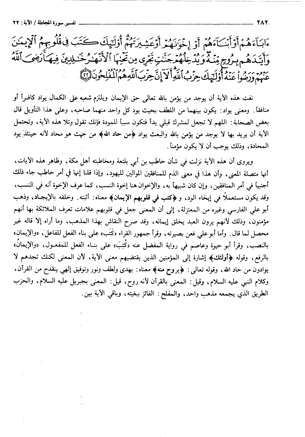 ويروى أن هذه الآية نزلت في شأن حاطب بن أبي بلتعة ومخاطبته أهل مكة، وظاهر هذه الآيات، أنها متصلة المعنى، وأن هذا في معنى الذم للمنافقين الموالين لليهود، وإذا قلنا إنها في أمر حاطب جاء ذلك أجنبيا في أمر المنافقين، وإن كان شبيها به، والإخوان هنا إخوة النسب، كما عرف الإخوة أنه في النسب، وقد يكون مستعملا في إيخاء الود، وكَتَبَ فِي قُلُوبِهِمُ الْإِيمانَ معناه: أثبته. وخلقه بالإيجاد، وذهب أبو على الفارسي وغيره من المعتزلة، إلى أن المعنى جعل في قلوبهم علامات تعرف الملائكة بها أنهم مؤمنون، وذلك لأنهم يرون العبد يخلق إيمانه، وقد صرح النقاش بهذا المذهب، وما أراه إلا قاله غير محصل لما قال. وأما أبو علي فعن بصيرته، وقرأ جمهور القراء «كتب» على بناء الفعل للفاعل، «والإيمان» بالنصب، وقرأ أبو حيوة وعاصم في رواية المفضل عنه «كتب» على بناء الفعل للمفعول، «والإيمان» بالرفع، وقوله أُولئِكَ إشارة إلى المؤمنين الذين يقتضيهم معنى الآية، لأن المعنى لكنك تجدهم لا يوادون من حاد الله، وقوله تعالى: بِرُوحٍ مِنْهُ معناه: بهدى ولطف ونور وتوفيق إلهي ينقدح من القرآن، وكلام النبي عليه السلام، وقيل: المعنى بالقرآن لأنه روح، قيل: المعنى بجبريل عليه السلام، والحزب الطريق الذي يجمعه مذهب واحد، والمفلح: الفائز ببغيته، وباقي الآية بين.