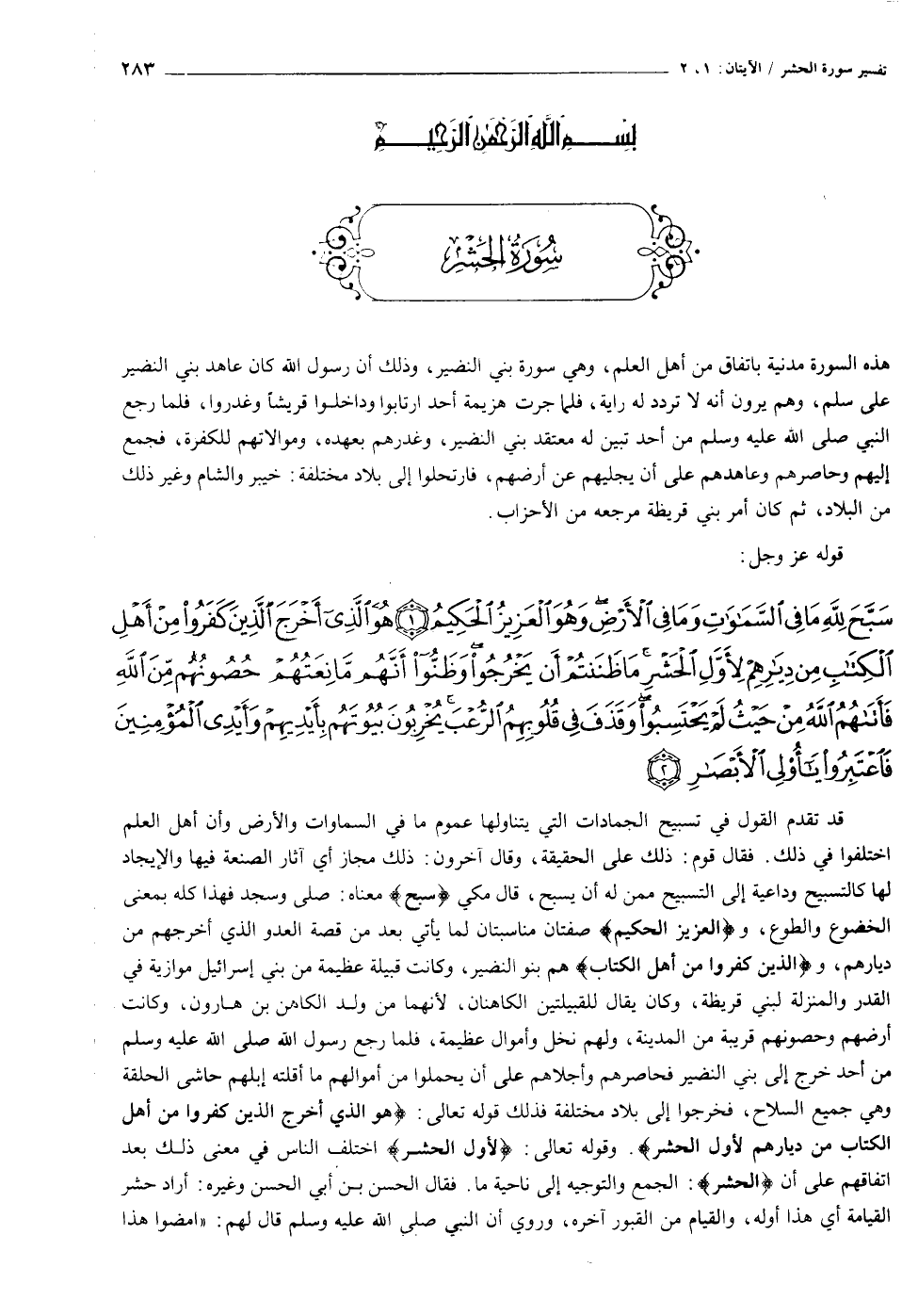 سَبَّحَ لِلَّهِ ما فِي السَّماواتِ وَما فِي الْأَرْضِ وَهُوَ الْعَزِيزُ الْحَكِيمُ (١) هُوَ الَّذِي أَخْرَجَ الَّذِينَ كَفَرُوا مِنْ أَهْلِ الْكِتابِ مِنْ دِيارِهِمْ لِأَوَّلِ الْحَشْرِ ما ظَنَنْتُمْ أَنْ يَخْرُجُوا وَظَنُّوا أَنَّهُمْ مانِعَتُهُمْ حُصُونُهُمْ مِنَ اللَّهِ فَأَتاهُمُ اللَّهُ مِنْ حَيْثُ لَمْ يَحْتَسِبُوا وَقَذَفَ فِي قُلُوبِهِمُ الرُّعْبَ يُخْرِبُونَ بُيُوتَهُمْ بِأَيْدِيهِمْ وَأَيْدِي الْمُؤْمِنِينَ فَاعْتَبِرُوا يا أُولِي الْأَبْصارِ (٢)