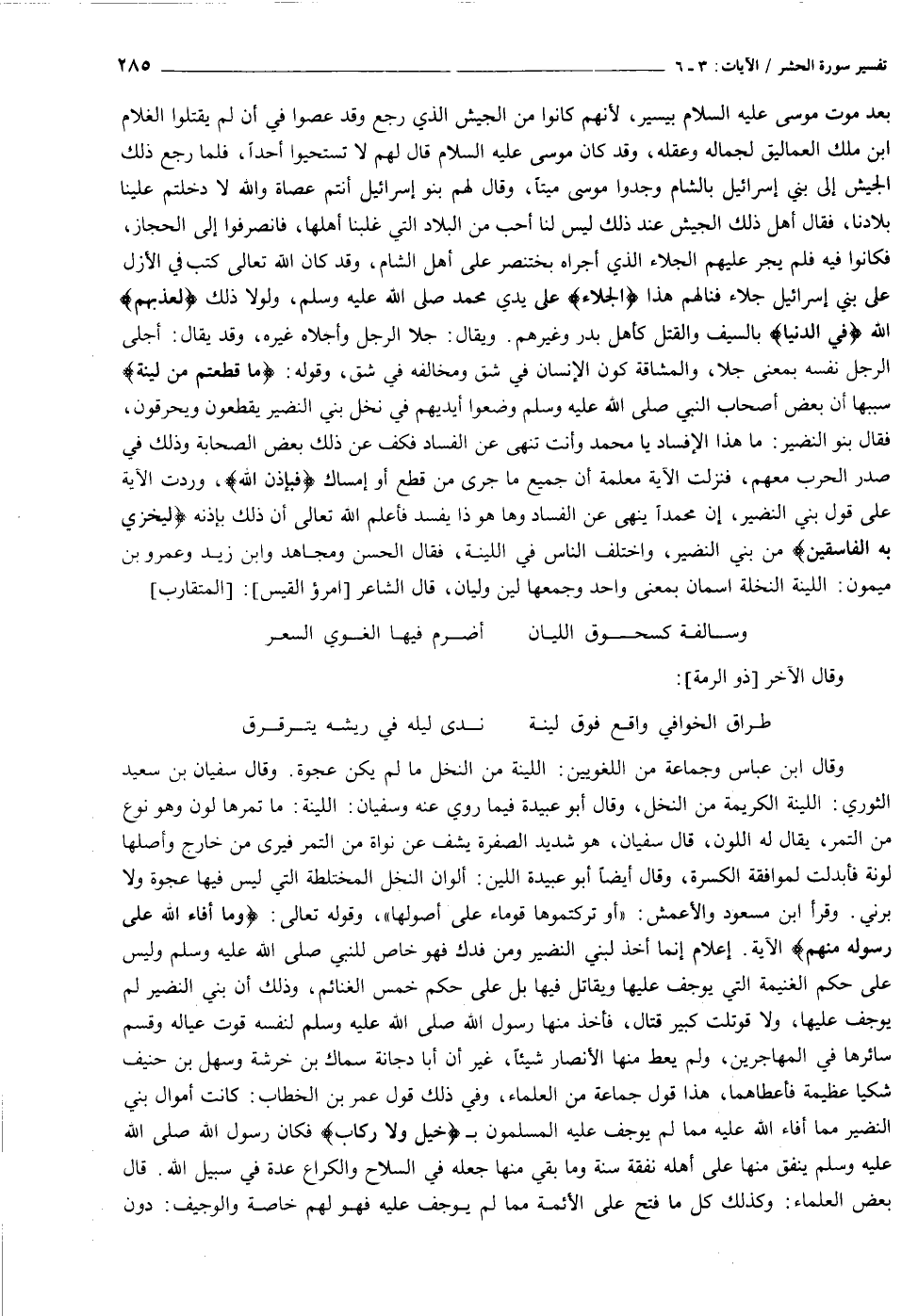 بعد موت موسى عليه السلام بيسير، لأنهم كانوا من الجيش الذي رجع وقد عصوا في أن لم يقتلوا الغلام ابن ملك العماليق لجماله وعقله، وقد كان موسى عليه السلام قال لهم لا تستحيوا أحدا، فلما رجع ذلك الجيش إلى بني إسرائيل بالشام وجدوا موسى ميتا، وقال لهم بنو إسرائيل أنتم عصاة والله لا دخلتم علينا بلادنا، فقال أهل ذلك الجيش عند ذلك ليس لنا أحب من البلاد التي غلبنا أهلها، فانصرفوا إلى الحجاز، فكانوا فيه فلم يجر عليهم الجلاء الذي أجراه بختنصر على أهل الشام، وقد كان الله تعالى كتب في الأزل على بني إسرائيل جلاء فنالهم هذا الْجَلاءَ على يدي محمد صلى الله عليه وسلم، ولولا ذلك لَعَذَّبَهُمْ الله فِي الدُّنْيا بالسيف والقتل كأهل بدر وغيرهم. ويقال: جلا الرجل وأجلاه غيره، وقد يقال: أجلى الرجل نفسه بمعنى جلا، والمشاقة كون الإنسان في شق ومخالفه في شق، وقوله: ما قَطَعْتُمْ مِنْ لِينَةٍ سببها أن بعض أصحاب النبي صلى الله عليه وسلم وضعوا أيديهم في نخل بني النضير يقطعون ويحرقون، فقال بنو النضير: ما هذا الإفساد يا محمد وأنت تنهى عن الفساد فكف عن ذلك بعض الصحابة وذلك في صدر الحرب معهم، فنزلت الآية معلمة أن جميع ما جرى من قطع أو إمساك فَبِإِذْنِ اللَّهِ، وردت الآية على قول بني النضير، إن محمدا ينهى عن الفساد وها هو ذا يفسد فأعلم الله تعالى أن ذلك بإذنه لِيُخْزِيَ به الْفاسِقِينَ من بني النضير، واختلف الناس في اللينة، فقال الحسن ومجاهد وابن زيد وعمرو بن ميمون: اللينة النخلة اسمان بمعنى واحد وجمعها لين وليان، قال الشاعر [امرؤ القيس] : [المتقارب]