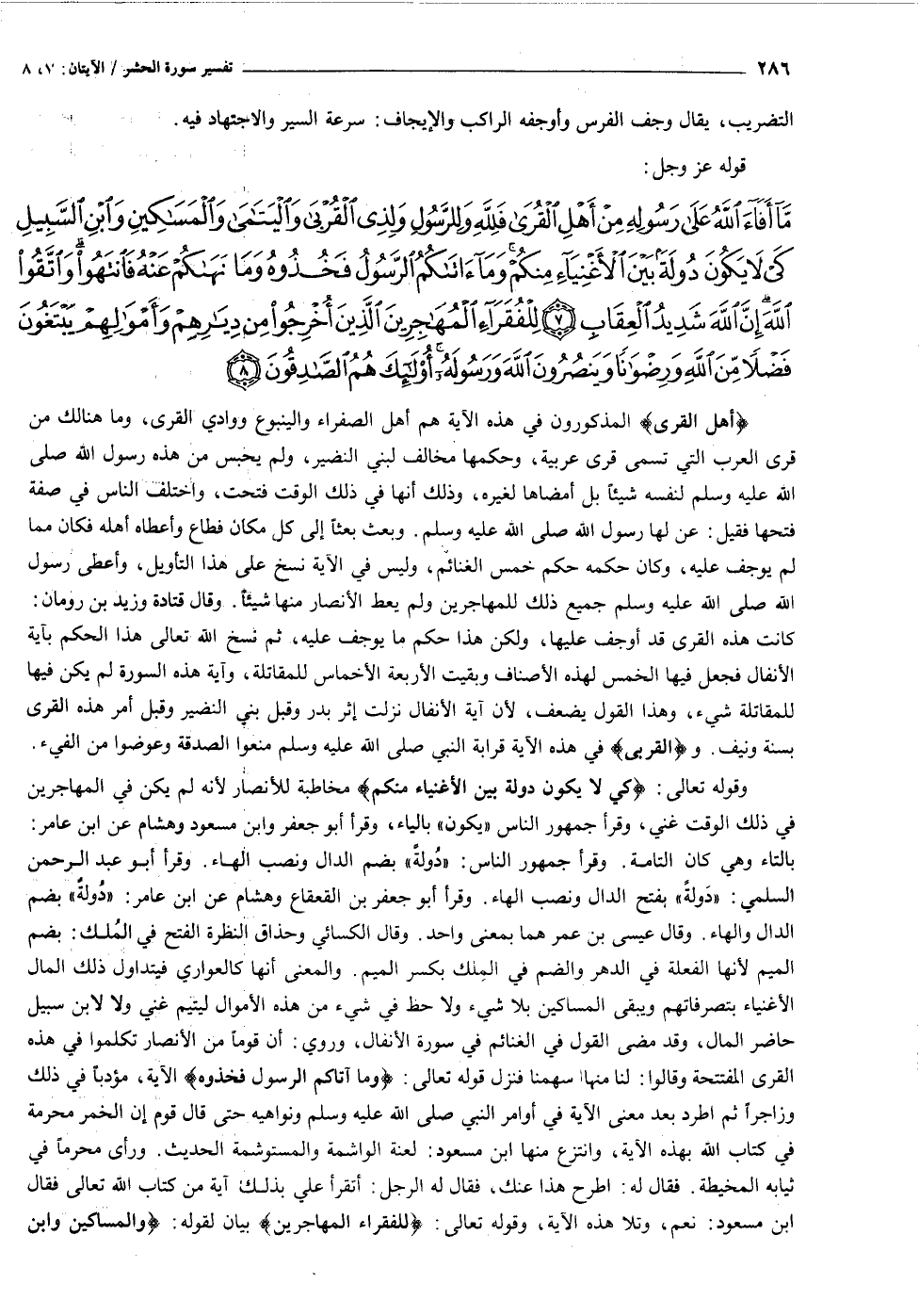ما أَفاءَ اللَّهُ عَلى رَسُولِهِ مِنْ أَهْلِ الْقُرى فَلِلَّهِ وَلِلرَّسُولِ وَلِذِي الْقُرْبى وَالْيَتامى وَالْمَساكِينِ وَابْنِ السَّبِيلِ كَيْ لا يَكُونَ دُولَةً بَيْنَ الْأَغْنِياءِ مِنْكُمْ وَما آتاكُمُ الرَّسُولُ فَخُذُوهُ وَما نَهاكُمْ عَنْهُ فَانْتَهُوا وَاتَّقُوا اللَّهَ إِنَّ اللَّهَ شَدِيدُ الْعِقابِ (٧) لِلْفُقَراءِ الْمُهاجِرِينَ الَّذِينَ أُخْرِجُوا مِنْ دِيارِهِمْ وَأَمْوالِهِمْ يَبْتَغُونَ فَضْلاً مِنَ اللَّهِ وَرِضْواناً وَيَنْصُرُونَ اللَّهَ وَرَسُولَهُ أُولئِكَ هُمُ الصَّادِقُونَ (٨)