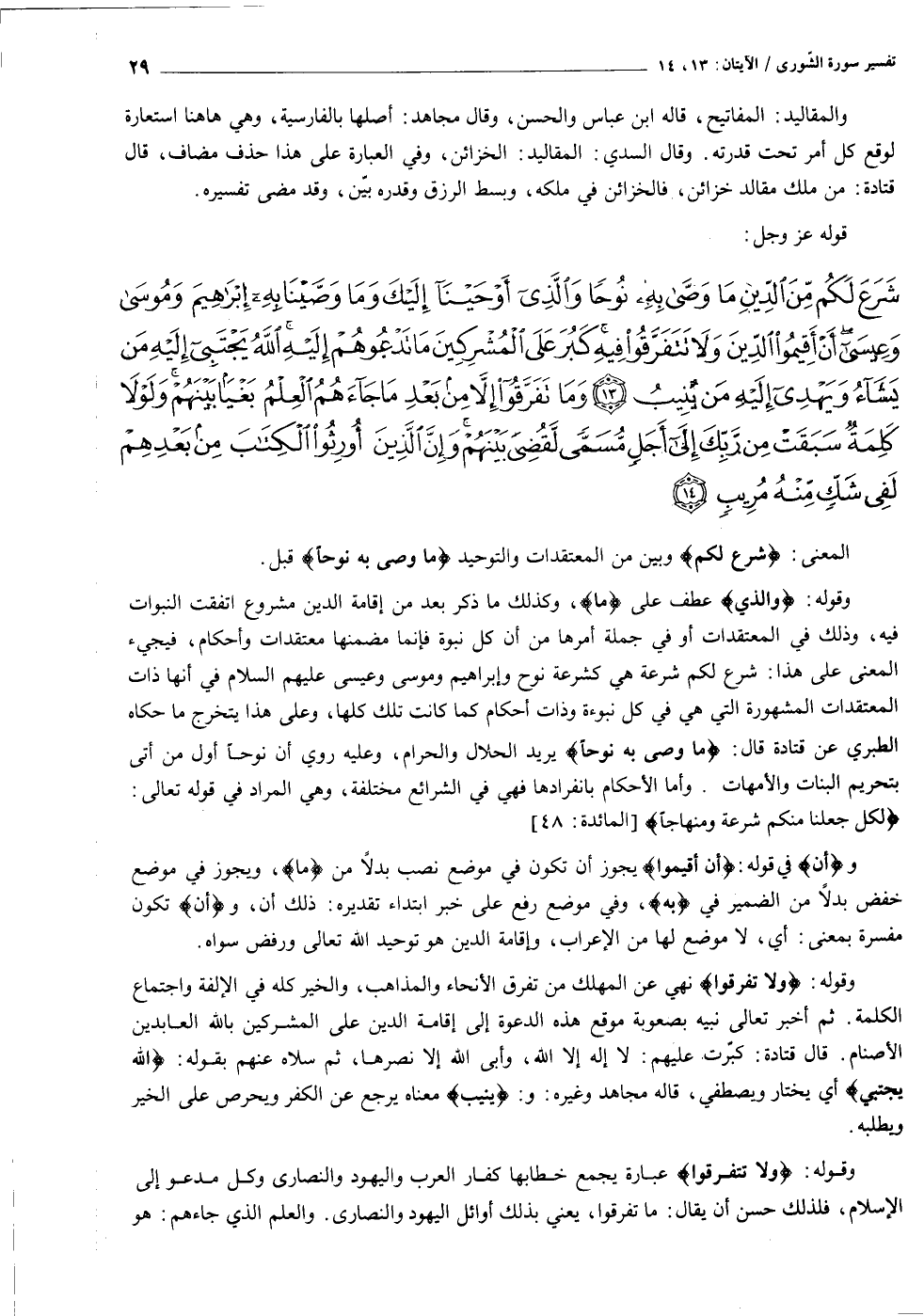 شَرَعَ لَكُمْ مِنَ الدِّينِ ما وَصَّى بِهِ نُوحاً وَالَّذِي أَوْحَيْنا إِلَيْكَ وَما وَصَّيْنا بِهِ إِبْراهِيمَ وَمُوسى وَعِيسى أَنْ أَقِيمُوا الدِّينَ وَلا تَتَفَرَّقُوا فِيهِ كَبُرَ عَلَى الْمُشْرِكِينَ ما تَدْعُوهُمْ إِلَيْهِ اللَّهُ يَجْتَبِي إِلَيْهِ مَنْ يَشاءُ وَيَهْدِي إِلَيْهِ مَنْ يُنِيبُ (١٣) وَما تَفَرَّقُوا إِلاَّ مِنْ بَعْدِ ما جاءَهُمُ الْعِلْمُ بَغْياً بَيْنَهُمْ وَلَوْلا كَلِمَةٌ سَبَقَتْ مِنْ رَبِّكَ إِلى أَجَلٍ مُسَمًّى لَقُضِيَ بَيْنَهُمْ وَإِنَّ الَّذِينَ أُورِثُوا الْكِتابَ مِنْ بَعْدِهِمْ لَفِي شَكٍّ مِنْهُ مُرِيبٍ (١٤)
