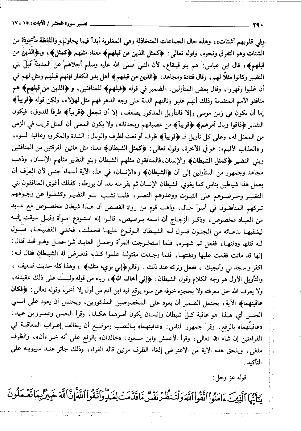 ظرف أو نعت لظرف والوبال: الشدة والمكروه وعاقبة السوء، و «العذاب الأليم» : هو في الآخرة، وقوله تعالى: كَمَثَلِ الشَّيْطانِ معناه مثل هاتين الفرقتين من المنافقين وبني النضير كَمَثَلِ الشَّيْطانِ والإنسان، فالمنافقون مثلهم الشيطان وبنو النضير مثلهم الإنسان، وذهب مجاهد وجمهور من المتأولين إلى أن «الشيطان» و «الإنسان» في هذه الآية أسماء جنس لأن العرف أن يعمل هذا شياطين بناس كما يغوي الشيطان الإنسان ثم يفر منه بعد أن يورطه، كذلك أغوى المنافقون بني النضير وحرضوهم على الثبوت ووعدوهم النصر، فلما نشب بنو النضير وكشفوا عن وجوههم تركهم المنافقون في أسوأ حال، وذهب قوم من رواة القصص أن هذا شيطان مخصوص مع عابد من العباد مخصوص، وذكر الزجاج أن اسمه برصيص، قالوا إنه استودع امرأة وقيل سيقت إليه ليشفيها بدعائه من الجنون فسول له الشيطان الوقوع عليها فحملت، فخشي الفضيحة، فسول له قتلها ودفنها، ففعل ثم شهره، فلما استخرجت المرأة وحمل العابد شر حمل وهو قد قال: