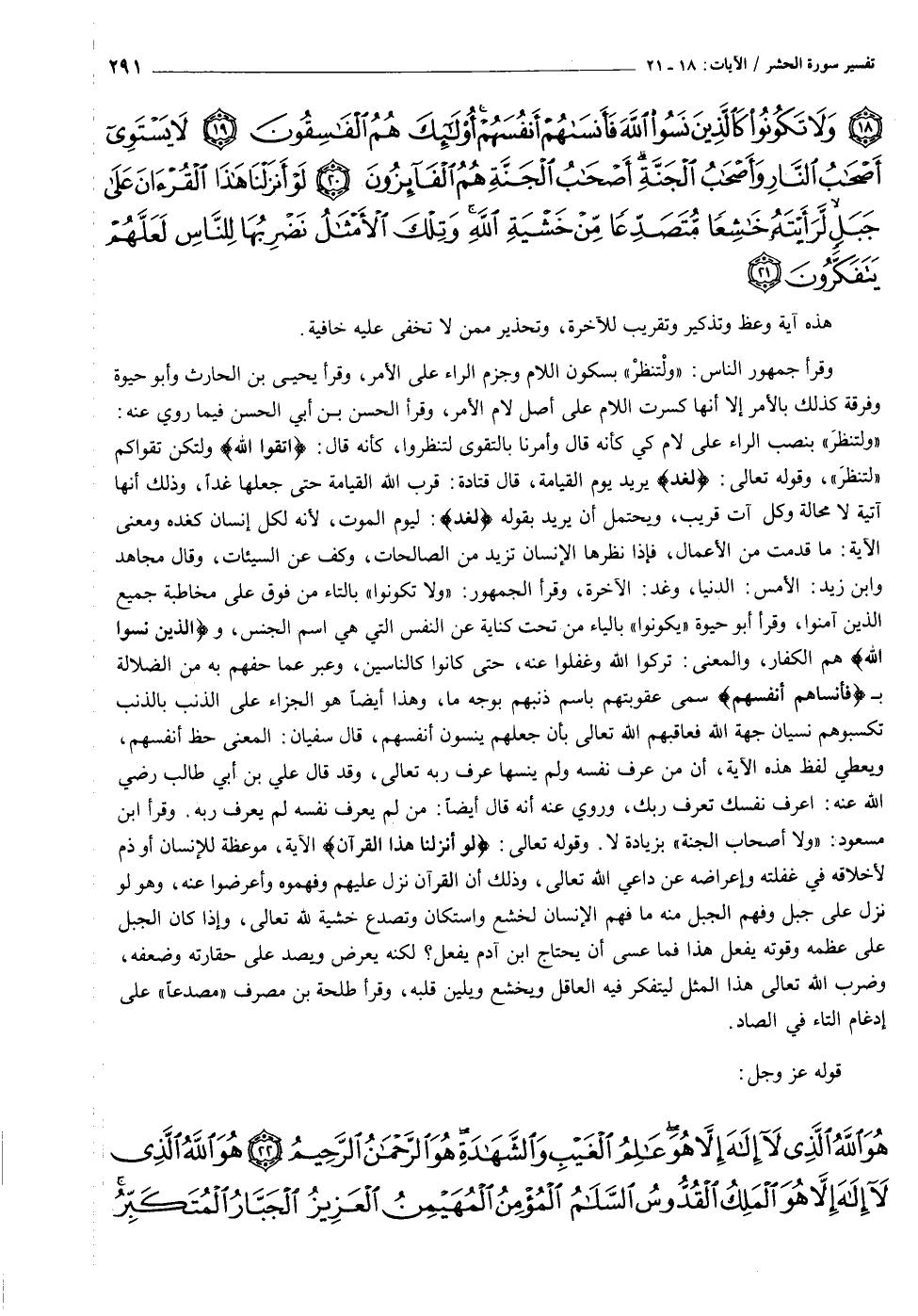 «ولتنظر» بنصب الراء على لام كي كأنه قال وأمرنا بالتقوى لتنظروا، كأنه قال: اتَّقُوا اللَّهَ ولتكن تقواكم «لتنظر» ، وقوله تعالى: لِغَدٍ يريد يوم القيامة، قال قتادة: قرب الله القيامة حتى جعلها غدا، وذلك أنها آتية لا محالة وكل آت قريب، ويحتمل أن يريد بقوله لِغَدٍ: ليوم الموت، لأنه لكل إنسان كغده ومعنى الآية: ما قدمت من الأعمال، فإذا نظرها الإنسان تزيد من الصالحات، وكف عن السيئات، وقال مجاهد وابن زيد: الأمس: الدنيا، وغد: الآخرة، وقرأ الجمهور: «ولا تكونوا» بالتاء من فوق على مخاطبة جميع الذين آمنوا، وقرأ أبو حيوة «يكونوا» بالياء من تحت كناية عن النفس التي هي اسم الجنس، والذين نَسُوا اللَّهَ هم الكفار، والمعنى: تركوا الله وغفلوا عنه، حتى كانوا كالناسين، وعبر عما حفهم به من الضلالة ب فَأَنْساهُمْ أَنْفُسَهُمْ سمى عقوبتهم باسم ذنبهم بوجه ما، وهذا أيضا هو الجزاء على الذنب بالذنب تكسبوهم نسيان جهة الله فعاقبهم الله تعالى بأن جعلهم ينسون أنفسهم، قال سفيان: المعنى حظ أنفسهم، ويعطي لفظ هذه الآية، أن من عرف نفسه ولم ينسها عرف ربه تعالى، وقد قال علي بن أبي طالب رضي الله عنه: اعرف نفسك تعرف ربك، وروي عنه أنه قال أيضا: من لم يعرف نفسه لم يعرف ربه. وقرأ ابن مسعود: «ولا أصحاب الجنة» بزيادة لا. وقوله تعالى: لَوْ أَنْزَلْنا هذَا الْقُرْآنَ الآية، موعظة للإنسان أو ذم لأخلاقه في غفلته وإعراضه عن داعي الله تعالى، وذلك أن القرآن نزل عليهم وفهموه وأعرضوا عنه، وهو لو نزل على جبل وفهم الجبل منه ما فهم الإنسان لخشع واستكان وتصدع خشية الله تعالى، وإذا كان الجبل على عظمه وقوته يفعل هذا فما عسى أن يحتاج ابن آدم يفعل؟ لكنه يعرض ويصد على حقارته وضعفه، وضرب الله تعالى هذا المثل ليتفكر فيه العاقل ويخشع ويلين قلبه، وقرأ طلحة بن مصرف «مصدعا» على إدغام التاء في الصاد.