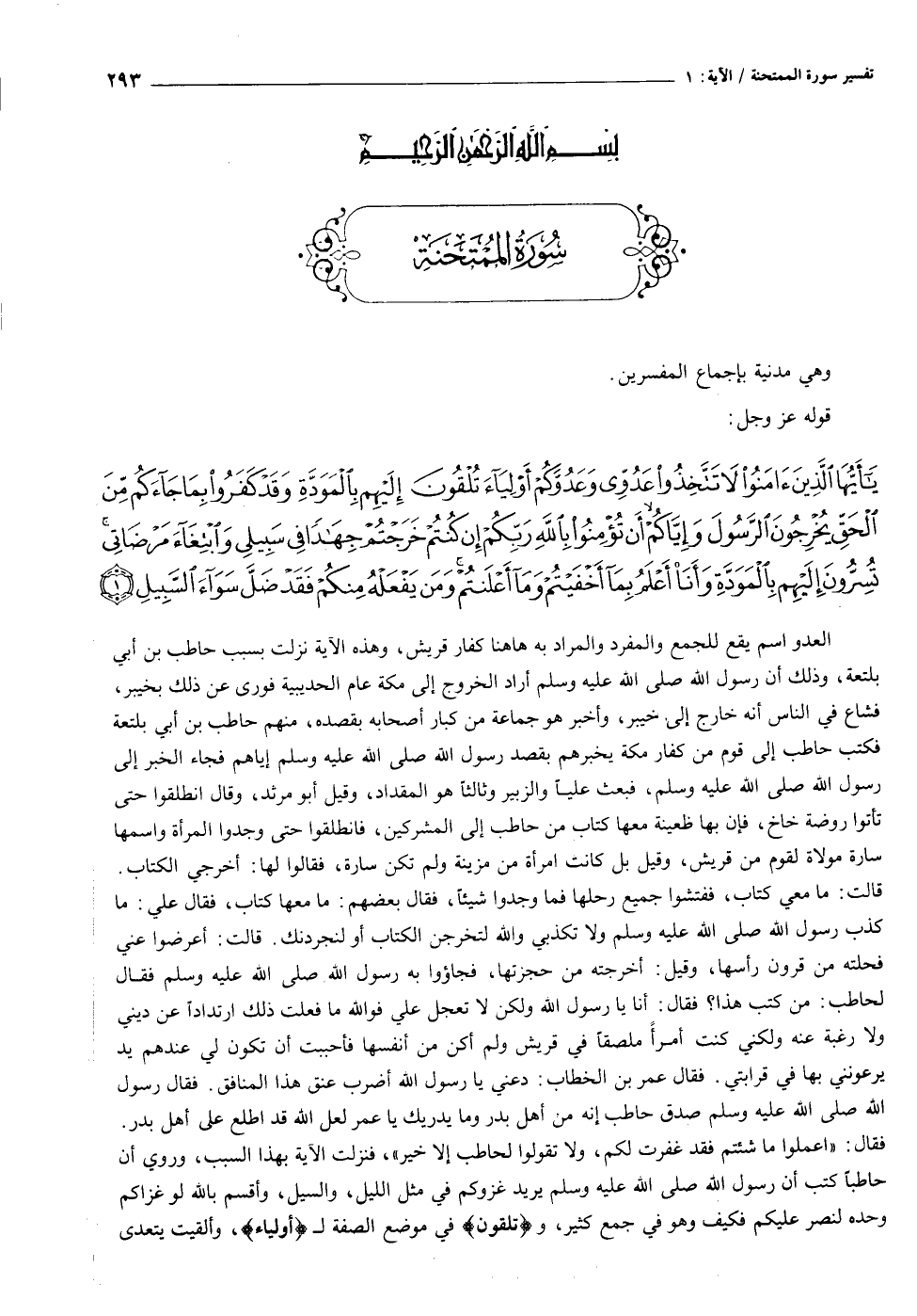 يا أَيُّهَا الَّذِينَ آمَنُوا لا تَتَّخِذُوا عَدُوِّي وَعَدُوَّكُمْ أَوْلِياءَ تُلْقُونَ إِلَيْهِمْ بِالْمَوَدَّةِ وَقَدْ كَفَرُوا بِما جاءَكُمْ مِنَ الْحَقِّ يُخْرِجُونَ الرَّسُولَ وَإِيَّاكُمْ أَنْ تُؤْمِنُوا بِاللَّهِ رَبِّكُمْ إِنْ كُنْتُمْ خَرَجْتُمْ جِهاداً فِي سَبِيلِي وَابْتِغاءَ مَرْضاتِي تُسِرُّونَ إِلَيْهِمْ بِالْمَوَدَّةِ وَأَنَا أَعْلَمُ بِما أَخْفَيْتُمْ وَما أَعْلَنْتُمْ وَمَنْ يَفْعَلْهُ مِنْكُمْ فَقَدْ ضَلَّ سَواءَ السَّبِيلِ (١)