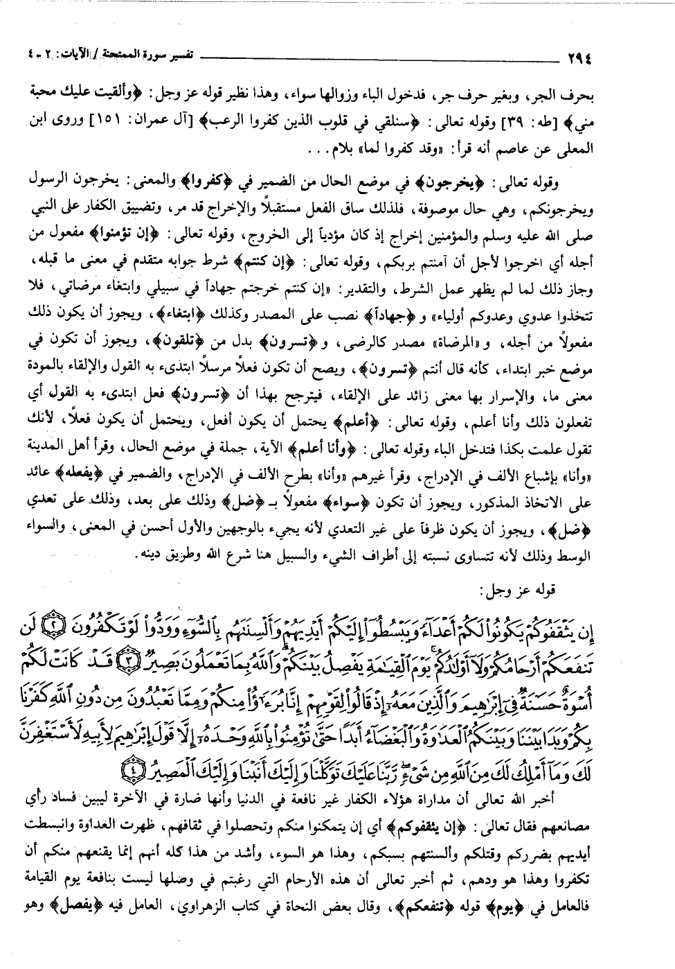 إِنْ يَثْقَفُوكُمْ يَكُونُوا لَكُمْ أَعْداءً وَيَبْسُطُوا إِلَيْكُمْ أَيْدِيَهُمْ وَأَلْسِنَتَهُمْ بِالسُّوءِ وَوَدُّوا لَوْ تَكْفُرُونَ (٢) لَنْ تَنْفَعَكُمْ أَرْحامُكُمْ وَلا أَوْلادُكُمْ يَوْمَ الْقِيامَةِ يَفْصِلُ بَيْنَكُمْ وَاللَّهُ بِما تَعْمَلُونَ بَصِيرٌ (٣) قَدْ كانَتْ لَكُمْ أُسْوَةٌ حَسَنَةٌ فِي إِبْراهِيمَ وَالَّذِينَ مَعَهُ إِذْ قالُوا لِقَوْمِهِمْ إِنَّا بُرَآؤُا مِنْكُمْ وَمِمَّا تَعْبُدُونَ مِنْ دُونِ اللَّهِ كَفَرْنا بِكُمْ وَبَدا بَيْنَنا وَبَيْنَكُمُ الْعَداوَةُ وَالْبَغْضاءُ أَبَداً حَتَّى تُؤْمِنُوا بِاللَّهِ وَحْدَهُ إِلاَّ قَوْلَ إِبْراهِيمَ لِأَبِيهِ لَأَسْتَغْفِرَنَّ لَكَ وَما أَمْلِكُ لَكَ مِنَ اللَّهِ مِنْ شَيْءٍ رَبَّنا عَلَيْكَ تَوَكَّلْنا وَإِلَيْكَ أَنَبْنا وَإِلَيْكَ الْمَصِيرُ (٤)