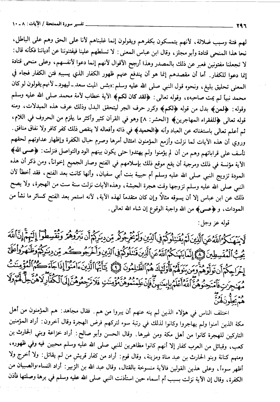 لا يَنْهاكُمُ اللَّهُ عَنِ الَّذِينَ لَمْ يُقاتِلُوكُمْ فِي الدِّينِ وَلَمْ يُخْرِجُوكُمْ مِنْ دِيارِكُمْ أَنْ تَبَرُّوهُمْ وَتُقْسِطُوا إِلَيْهِمْ إِنَّ اللَّهَ يُحِبُّ الْمُقْسِطِينَ (٨) إِنَّما يَنْهاكُمُ اللَّهُ عَنِ الَّذِينَ قاتَلُوكُمْ فِي الدِّينِ وَأَخْرَجُوكُمْ مِنْ دِيارِكُمْ وَظاهَرُوا عَلى إِخْراجِكُمْ أَنْ تَوَلَّوْهُمْ وَمَنْ يَتَوَلَّهُمْ فَأُولئِكَ هُمُ الظَّالِمُونَ (٩) يا أَيُّهَا الَّذِينَ آمَنُوا إِذا جاءَكُمُ الْمُؤْمِناتُ مُهاجِراتٍ فَامْتَحِنُوهُنَّ اللَّهُ أَعْلَمُ بِإِيمانِهِنَّ فَإِنْ عَلِمْتُمُوهُنَّ مُؤْمِناتٍ فَلا تَرْجِعُوهُنَّ إِلَى الْكُفَّارِ لا هُنَّ حِلٌّ لَهُمْ وَلا هُمْ يَحِلُّونَ لَهُنَّ وَآتُوهُمْ ما أَنْفَقُوا وَلا جُناحَ عَلَيْكُمْ أَنْ تَنْكِحُوهُنَّ إِذا آتَيْتُمُوهُنَّ أُجُورَهُنَّ وَلا تُمْسِكُوا بِعِصَمِ الْكَوافِرِ وَسْئَلُوا ما أَنْفَقْتُمْ وَلْيَسْئَلُوا ما أَنْفَقُوا ذلِكُمْ حُكْمُ اللَّهِ يَحْكُمُ بَيْنَكُمْ وَاللَّهُ عَلِيمٌ حَكِيمٌ (١٠) وَإِنْ فاتَكُمْ شَيْءٌ مِنْ أَزْواجِكُمْ إِلَى الْكُفَّارِ فَعاقَبْتُمْ فَآتُوا الَّذِينَ ذَهَبَتْ أَزْواجُهُمْ مِثْلَ ما أَنْفَقُوا وَاتَّقُوا اللَّهَ الَّذِي أَنْتُمْ بِهِ مُؤْمِنُونَ (١١)