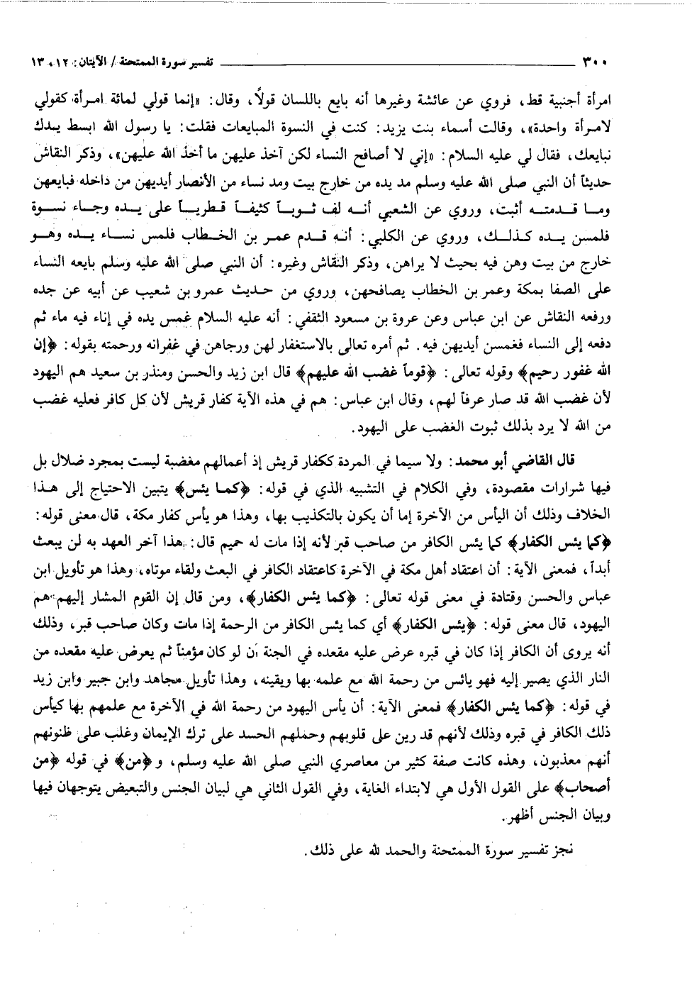 امرأة أجنبية قط، فروي عن عائشة وغيرها أنه بايع باللسان قولا، وقال: «إنما قولي لمائة امرأة كقولي لامرأة واحدة» ، وقالت أسماء بنت يزيد: كنت في النسوة المبايعات فقلت: يا رسول الله ابسط يدك نبايعك، فقال لي عليه السلام: «إني لا أصافح النساء لكن آخذ عليهن ما أخذ الله عليهن» ، وذكر النقاش حديثا أن النبي صلى الله عليه وسلم مد يده من خارج بيت ومد نساء من الأنصار أيديهن من داخله فبايعهن وما قدمته أثبت، وروي عن الشعبي أنه لف ثوبا كثيفا قطريا على يده وجاء نسوة فلمسن يده كذلك، وروي عن الكلبي: أنه قدم عمر بن الخطاب فلمس نساء يده وهو خارج من بيت وهن فيه بحيث لا يراهن، وذكر النقاش وغيره: أن النبي صلى الله عليه وسلم بايعه النساء على الصفا بمكة وعمر بن الخطاب يصافحهن، وروي من حديث عمرو بن شعيب عن أبيه عن جده ورفعه النقاش عن ابن عباس وعن عروة بن مسعود الثقفي: أنه عليه السلام غمس يده في إناء فيه ماء ثم دفعه إلى النساء فغمسن أيديهن فيه. ثم أمره تعالى بالاستغفار لهن ورجاهن في غفرانه ورحمته بقوله: إِنَّ اللَّهَ غَفُورٌ رَحِيمٌ وقوله تعالى: قَوْماً غَضِبَ اللَّهُ عَلَيْهِمْ قال ابن زيد والحسن ومنذر بن سعيد هم اليهود لأن غضب الله قد صار عرفا لهم، وقال ابن عباس: هم في هذه الآية كفار قريش لأن كل كافر فعليه غضب من الله لا يرد بذلك ثبوت الغضب على اليهود.
