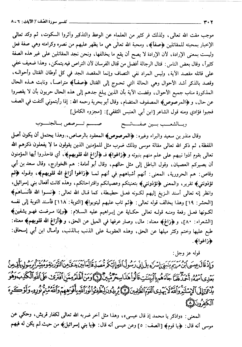 وقال منذر بن سعيد والبراء وغيره: «المرصوص» المعقود بالرصاص، وهذا يحتمل أن يكون أصل اللفظة، ثم ذكر الله تعالى مقالة موسى وذلك ضرب مثل للمؤمنين الذين يقولون ما لا يفعلون ذكرهم الله تعالى بقوم آذوا نبيهم على علم منهم بنبوته وزاغُوا ف أَزاغَ اللَّهُ قُلُوبَهُمْ، أي فاحذروا أيها المؤمنون أن يصيركم العصيان، وقول الباطل إلى مثل حالهم، وقال أبو أمامة: هم الخوارج، وقال سعد بن أبي وقاص: هم الحرورية، المعنى: أنهم أشباههم في أنهم لما زاغُوا أَزاغَ اللَّهُ قُلُوبَهُمْ، وقوله لِمَ تُؤْذُونَنِي تقرير، والمعنى تُؤْذُونَنِي بتعنيتكم وعصيانكم واقتراحاتكم، وهذه كانت أفعال بني إسرائيل، وانظر إنه تعالى أسند الزيغ إليهم لكونه فعل حطيطة، كما قال الله تعالى: نَسُوا اللَّهَ فَأَنْساهُمْ [الحشر: ١٩] وهذا يخالف قوله تعالى: ثُمَّ تابَ عَلَيْهِمْ لِيَتُوبُوا [التوبة: ١١٨] فأسند التوبة إلى نفسه لكونها فعل رفعة ومنه قوله تعالى حكاية عن إبراهيم عليه السلام: وَإِذا مَرِضْتُ فَهُوَ يَشْفِينِ [الشعراء: ٨٠] ، و «زاغ» معناه: مال، وصار عرفها في الميل عن الحق، وأَزاغَ اللَّهُ قُلُوبَهُمْ معناه: