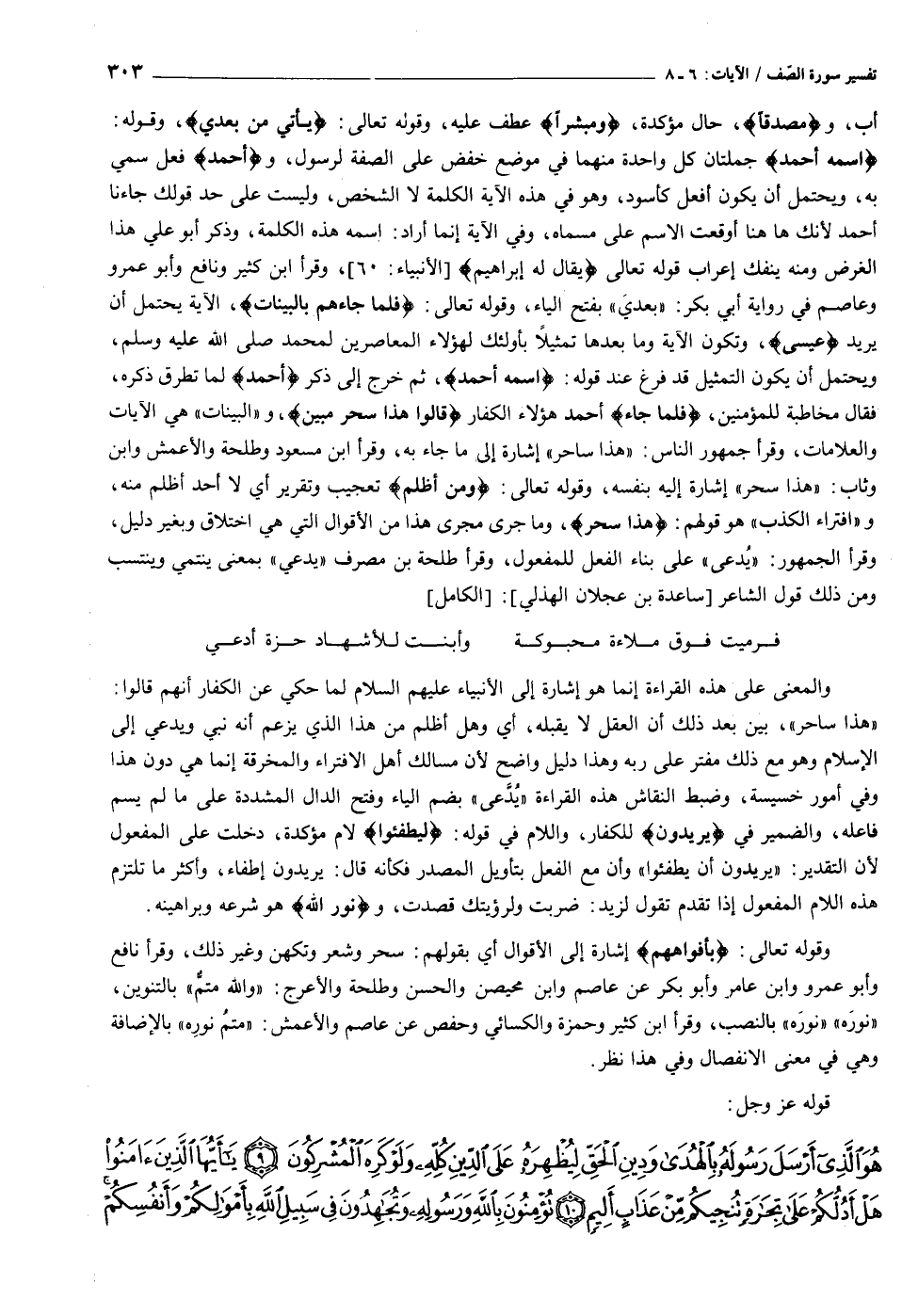 اسْمُهُ أَحْمَدُ جملتان كل واحدة منهما في موضع خفض على الصفة لرسول، وأَحْمَدُ فعل سمي به، ويحتمل أن يكون أفعل كأسود، وهو في هذه الآية الكلمة لا الشخص، وليست على حد قولك جاءنا أحمد لأنك هاهنا أوقعت الاسم على مسماه، وفي الآية إنما أراد: اسمه هذه الكلمة، وذكر أبو علي هذا الغرض ومنه ينفك إعراب قوله تعالى يُقالُ لَهُ إِبْراهِيمُ [الأنبياء: ٦٠] ، وقرأ ابن كثير ونافع وأبو عمرو وعاصم في رواية أبي بكر: «بعدي» بفتح الياء، وقوله تعالى: فَلَمَّا جاءَهُمْ بِالْبَيِّناتِ، الآية يحتمل أن يريد عِيسَى، وتكون الآية وما بعدها تمثيلا بأولئك لهؤلاء المعاصرين لمحمد صلى الله عليه وسلم، ويحتمل أن يكون التمثيل قد فرغ عند قوله: اسْمُهُ أَحْمَدُ، ثم خرج إلى ذكر أَحْمَدُ لما تطرق ذكره، فقال مخاطبة للمؤمنين، فَلَمَّا جاء أحمد هؤلاء الكفار قالُوا هذا سِحْرٌ مُبِينٌ، و «البينات» هي الآيات والعلامات، وقرأ جمهور الناس: «هذا ساحر» إشارة إلى ما جاء به، وقرأ ابن مسعود وطلحة والأعمش وابن وثاب: «هذا سحر» إشارة إليه بنفسه، وقوله تعالى: وَمَنْ أَظْلَمُ تعجيب وتقرير أي لا أحد أظلم منه، و «افتراء الكذب» هو قولهم: هذا سِحْرٌ، وما جرى مجرى هذا من الأقوال التي هي اختلاق وبغير دليل، وقرأ الجمهور: «يدعى» على بناء الفعل للمفعول، وقرأ طلحة بن مصرف «يدعي» بمعنى ينتمي وينتسب ومن ذلك قول الشاعر [ساعدة بن عجلان الهذلي] : [الكامل]
