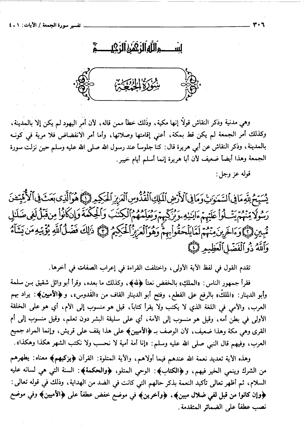 يُسَبِّحُ لِلَّهِ ما فِي السَّماواتِ وَما فِي الْأَرْضِ الْمَلِكِ الْقُدُّوسِ الْعَزِيزِ الْحَكِيمِ (١) هُوَ الَّذِي بَعَثَ فِي الْأُمِّيِّينَ رَسُولاً مِنْهُمْ يَتْلُوا عَلَيْهِمْ آياتِهِ وَيُزَكِّيهِمْ وَيُعَلِّمُهُمُ الْكِتابَ وَالْحِكْمَةَ وَإِنْ كانُوا مِنْ قَبْلُ لَفِي ضَلالٍ مُبِينٍ (٢) وَآخَرِينَ مِنْهُمْ لَمَّا يَلْحَقُوا بِهِمْ وَهُوَ الْعَزِيزُ الْحَكِيمُ (٣) ذلِكَ فَضْلُ اللَّهِ يُؤْتِيهِ مَنْ يَشاءُ وَاللَّهُ ذُو الْفَضْلِ الْعَظِيمِ (٤)