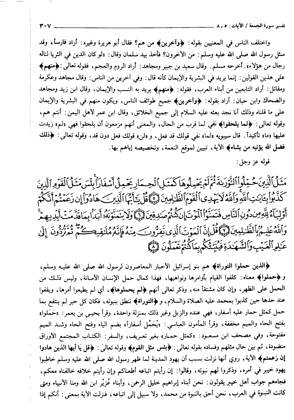 مَثَلُ الَّذِينَ حُمِّلُوا التَّوْراةَ ثُمَّ لَمْ يَحْمِلُوها كَمَثَلِ الْحِمارِ يَحْمِلُ أَسْفاراً بِئْسَ مَثَلُ الْقَوْمِ الَّذِينَ كَذَّبُوا بِآياتِ اللَّهِ وَاللَّهُ لا يَهْدِي الْقَوْمَ الظَّالِمِينَ (٥) قُلْ يا أَيُّهَا الَّذِينَ هادُوا إِنْ زَعَمْتُمْ أَنَّكُمْ أَوْلِياءُ لِلَّهِ مِنْ دُونِ النَّاسِ فَتَمَنَّوُا الْمَوْتَ إِنْ كُنْتُمْ صادِقِينَ (٦) وَلا يَتَمَنَّوْنَهُ أَبَداً بِما قَدَّمَتْ أَيْدِيهِمْ وَاللَّهُ عَلِيمٌ بِالظَّالِمِينَ (٧) قُلْ إِنَّ الْمَوْتَ الَّذِي تَفِرُّونَ مِنْهُ فَإِنَّهُ مُلاقِيكُمْ ثُمَّ تُرَدُّونَ إِلى عالِمِ الْغَيْبِ وَالشَّهادَةِ فَيُنَبِّئُكُمْ بِما كُنْتُمْ تَعْمَلُونَ (٨)