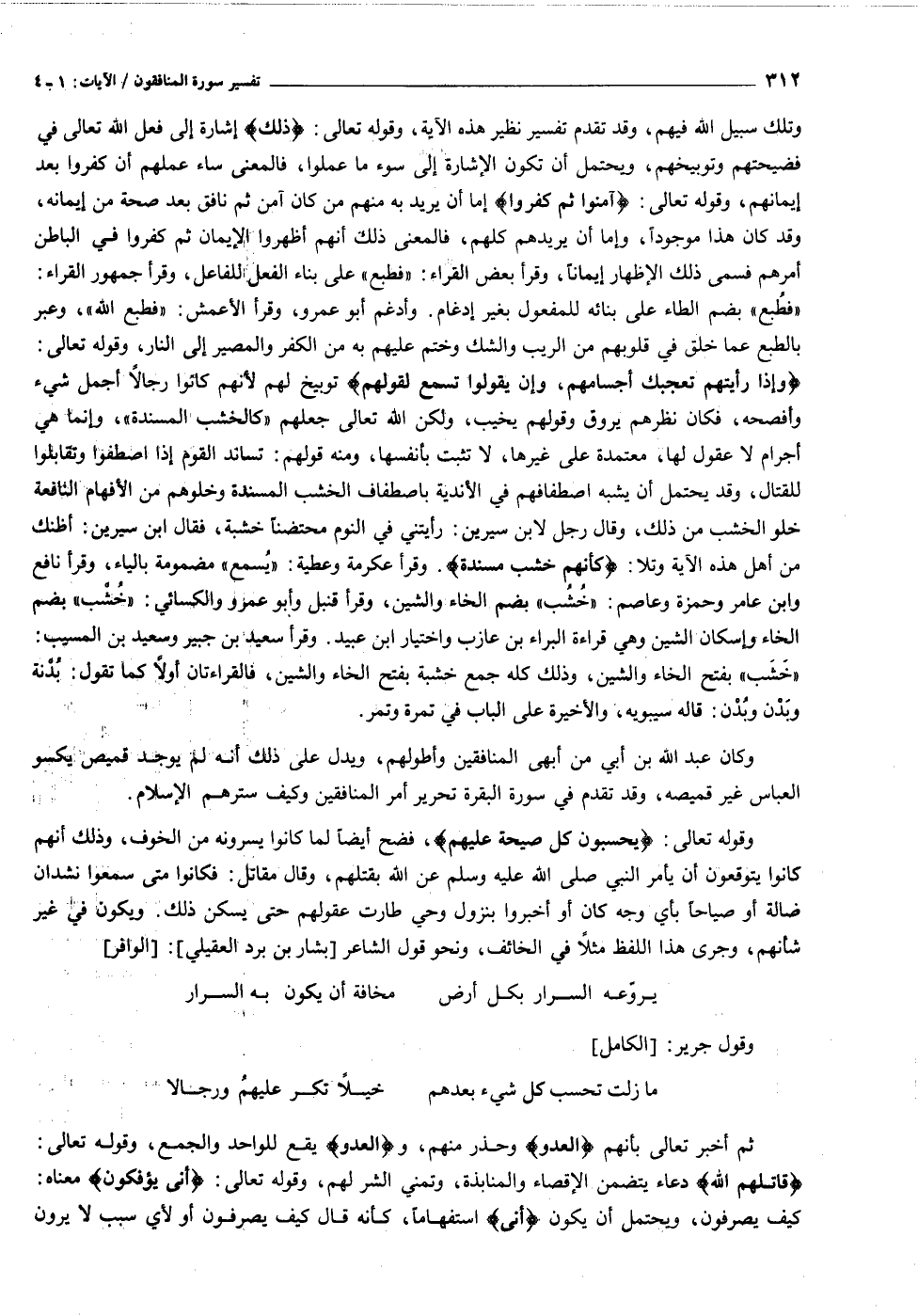 وَإِذا رَأَيْتَهُمْ تُعْجِبُكَ أَجْسامُهُمْ، وَإِنْ يَقُولُوا تَسْمَعْ لِقَوْلِهِمْ توبيخ لهم لأنهم كانوا رجالا أجمل شيء وأفصحه، فكان نظرهم يروق وقولهم يخيب، ولكن الله تعالى جعلهم «كالخشب المسندة» ، وإنما هي أجرام لا عقول لها، معتمدة على غيرها، لا تثبت بأنفسها، ومنه قولهم: تساند القوم إذا اصطفوا وتقابلوا للقتال، وقد يحتمل أن يشبه اصطفافهم في الأندية باصطفاف الخشب المسندة وخلوهم من الأفهام النافعة خلو الخشب من ذلك، وقال رجل لابن سيرين: رأيتني في النوم محتضنا خشبة، فقال ابن سيرين: أظنك من أهل هذه الآية وتلا: كَأَنَّهُمْ خُشُبٌ مُسَنَّدَةٌ. وقرأ عكرمة وعطية: «يسمع» مضمومة بالياء، وقرأ نافع وابن عامر وحمزة وعاصم: «خشب» بضم الخاء والشين، وقرأ قنبل وأبو عمرو والكسائي: «خشب» بضم الخاء وإسكان الشين وهي قراءة البراء بن عازب واختيار ابن عبيد. وقرأ سعيد بن جبير وسعيد بن المسيب: