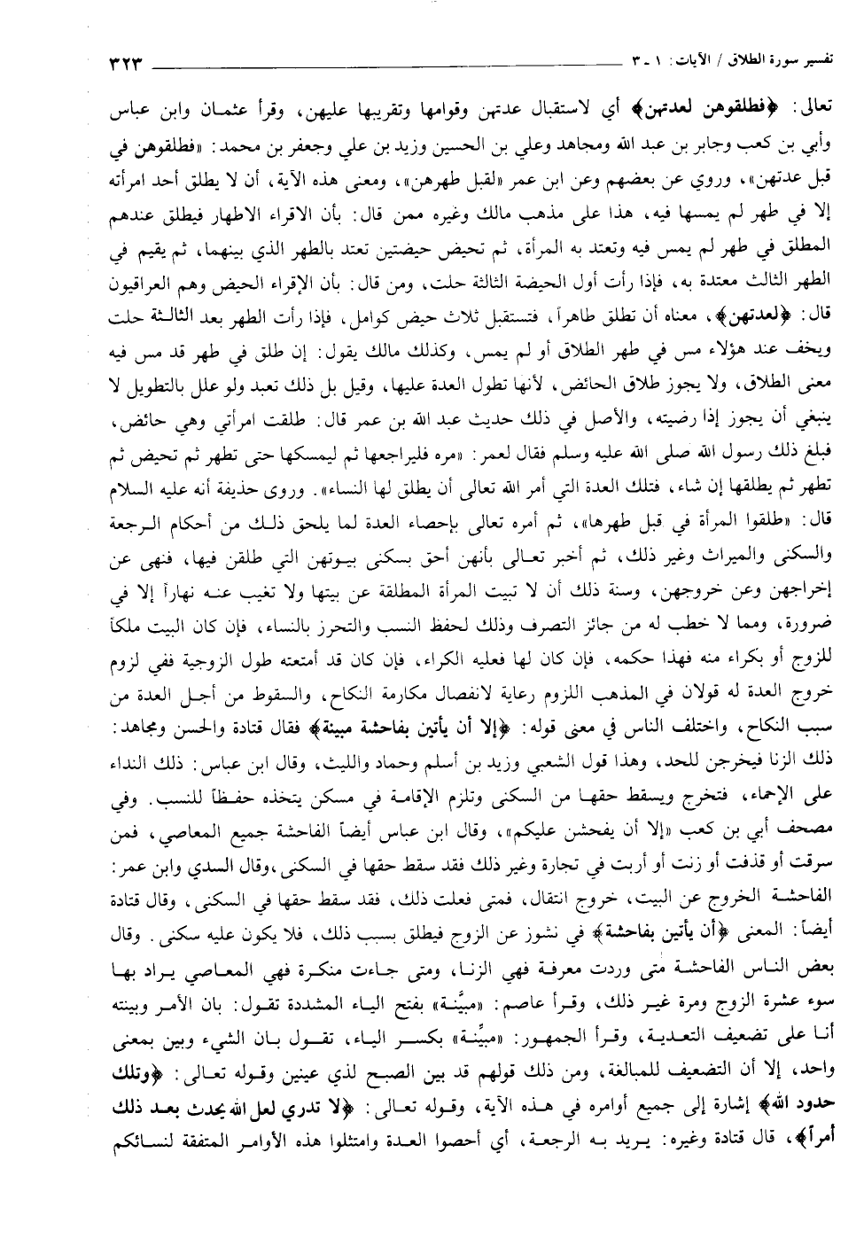 تعالى: فَطَلِّقُوهُنَّ لِعِدَّتِهِنَّ أي لاستقبال عدتهن وقوامها وتقريبها عليهن، وقرأ عثمان وابن عباس وأبي بن كعب وجابر بن عبد الله ومجاهد وعلي بن الحسين وزيد بن علي وجعفر بن محمد: «فطلقوهن في قبل عدتهن» ، وروي عن بعضهم وعن ابن عمر «لقبل طهرهن» ، ومعنى هذه الآية، أن لا يطلق أحد امرأته إلا في طهر لم يمسها فيه، هذا على مذهب مالك وغيره ممن قال: بأن الأقراء الاطهار فيطلق عندهم المطلق في طهر لم يمس فيه وتعتد به المرأة، ثم تحيض حيضتين تعتد بالطهر الذي بينهما، ثم يقيم في الطهر الثالث معتدة به، فإذا رأت أول الحيضة الثالثة حلت، ومن قال: بأن الإقراء الحيض وهم العراقيون قال: لِعِدَّتِهِنَّ، معناه أن تطلق طاهرا، فتستقبل ثلاث حيض كوامل، فإذا رأت الطهر بعد الثالثة حلت ويخف عند هؤلاء مس في طهر الطلاق أو لم يمس، وكذلك مالك يقول: إن طلق في طهر قد مس فيه معنى الطلاق، ولا يجوز طلاق الحائض، لأنها تطول العدة عليها، وقيل بل ذلك تعبد ولو علل بالتطويل لا ينبغي أن يجوز إذا رضيته، والأصل في ذلك حديث عبد الله بن عمر قال: طلقت امرأتي وهي حائض، فبلغ ذلك رسول الله صلى الله عليه وسلم فقال لعمر: «مره فليراجعها ثم ليمسكها حتى تطهر ثم تحيض ثم تطهر ثم يطلقها إن شاء، فتلك العدة التي أمر الله تعالى أن يطلق لها النساء» . وروى حذيفة أنه عليه السلام قال: «طلقوا المرأة في قبل طهرها» ، ثم أمره تعالى بإحصاء العدة لما يلحق ذلك من أحكام الرجعة والسكنى والميراث وغير ذلك، ثم أخبر تعالى بأنهن أحق بسكنى بيوتهن التي طلقن فيها، فنهى عن إخراجهن وعن خروجهن، وسنة ذلك أن لا تبيت المرأة المطلقة عن بيتها ولا تغيب عنه نهارا إلا في ضرورة، ومما لا خطب له من جائز التصرف وذلك لحفظ النسب والتحرز بالنساء، فإن كان البيت ملكا للزوج أو بكراء منه فهذا حكمه، فإن كان لها فعليه الكراء، فإن كان قد أمتعته طول الزوجية ففي لزوم خروج العدة له قولان في المذهب اللزوم رعاية لانفصال مكارمة النكاح، والسقوط من أجل العدة من سبب النكاح، واختلف الناس في معنى قوله: إِلَّا أَنْ يَأْتِينَ بِفاحِشَةٍ مُبَيِّنَةٍ فقال قتادة والحسن ومجاهد:
