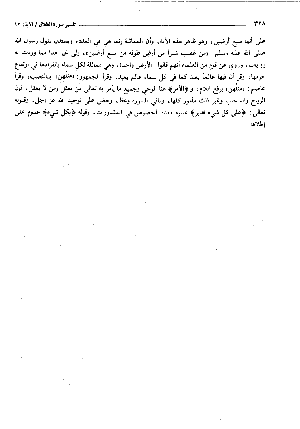 على أنها سبع أرضين، وهو ظاهر هذه الآية، وأن المماثلة إنما هي في العدد، ويستدل بقول رسول الله صلى الله عليه وسلم: «من غصب شبرا من أرض طوقه من سبع أرضين» ، إلى غير هذا مما وردت به روايات، وروي عن قوم من العلماء أنهم قالوا: الأرض واحدة، وهي مماثلة لكل سماء بانفرادها في ارتفاع جرمها، وقر أن فيها عالما يعبد كما في كل سماء عالم يعبد، وقرأ الجمهور: «مثلهن» بالنصب، وقرأ عاصم: «مثلهن» برفع اللام، والْأَمْرُ هنا الوحي وجميع ما يأمر به تعالى من يعقل ومن لا يعقل، فإن الرياح والسحاب وغير ذلك مأمور كلها، وباقي السورة وعظ، وحض على توحيد الله عز وجل، وقوله تعالى: عَلى كُلِّ شَيْءٍ قَدِيرٌ عموم معناه الخصوص في المقدورات، وقوله بِكُلِّ شَيْءٍ عموم على إطلاقه.