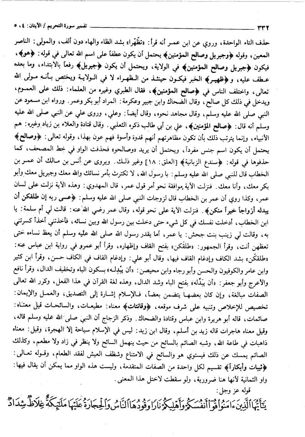 حذف التاء الواحدة، وروي عن ابن عمر أنه قرأ: «تظّهّرا» بشد الظاء والهاء دون ألف، والمولى: الناصر المعين، وقوله وَجِبْرِيلُ وَصالِحُ الْمُؤْمِنِينَ يحتمل أن يكون عطفا على اسم الله تعالى في قوله: هُوَ، فيكون جِبْرِيلُ وَصالِحُ الْمُؤْمِنِينَ في الولاية، ويحتمل أن يكون جِبْرِيلُ رفعا بالابتداء، وما بعده عطف عليه، وظَهِيرٌ الخبر فيكون حينئذ من الظهراء لا في الولاية ويختص بأنه مولى الله تعالى، واختلف الناس في صالِحُ الْمُؤْمِنِينَ، فقال الطبري وغيره من العلماء: ذلك على العموم، ويدخل في ذلك كل صالح، وقال الضحاك وابن جبير وعكرمة: المراد أبو بكر وعمر. ورواه ابن مسعود عن النبي صلى الله عليه وسلم، وقال مجاهد نحوه، وقال أيضا: وعلي، وروى علي عن النبي صلى الله عليه وسلم أنه قال: صالِحُ الْمُؤْمِنِينَ، علي بن أبي طالب ذكره الثعلبي. وقال قتادة والعلاء بن زياد وغيره: هم الأنبياء، وإنما يترتب ذلك بأن تكون مظاهرتهم أنهم قدوة وأسوة فهم عون بهذا، وقوله تعالى: وَصالِحُ يحتمل أن يكون اسم جنس مفردا، ويحتمل أن يريد «وصالحو» فحذفت الواو في خط المصحف، كما حذفوها في قوله: سَنَدْعُ الزَّبانِيَةَ [العلق: ١٨] وغير ذلك. ويروى عن أنس بن مالك أن عمر بن الخطاب قال للنبي صلى الله عليه وسلم: يا رسول الله، لا تكترث بأمر نسائك والله معك وجبريل معك وأبو بكر معك، وأنا معك. فنزلت الآية موافقة نحو أمر قول عمر، قال المهدوي: وهذه الآية نزلت على لسان عمر، وكذا روي أن عمر بن الخطاب قال لزوجات النبي صلى الله عليه وسلم: عَسى رَبُّهُ إِنْ طَلَّقَكُنَّ أَنْ يُبْدِلَهُ أَزْواجاً خَيْراً مِنْكُنَّ. فنزلت الآية على نحو قوله، وقال عمر رضي الله عنه: قالت لي أم سلمة: يا ابن الخطاب، أدخلت نفسك في كل شيء حتى دخلت بين رسول الله وبين نسائه، فأخذتني أخذا كسرتني به، وقالت لي زينب بنت جحش: يا عمر، أما يقدر رسول الله صلى الله عليه وسلم أن يعظ نساءه حتى تعظهن أنت، وقرأ الجمهور: «طلقكن» بفتح القاف وإظهاره، وقرأ أبو عمرو في رواية ابن عباس عنه: