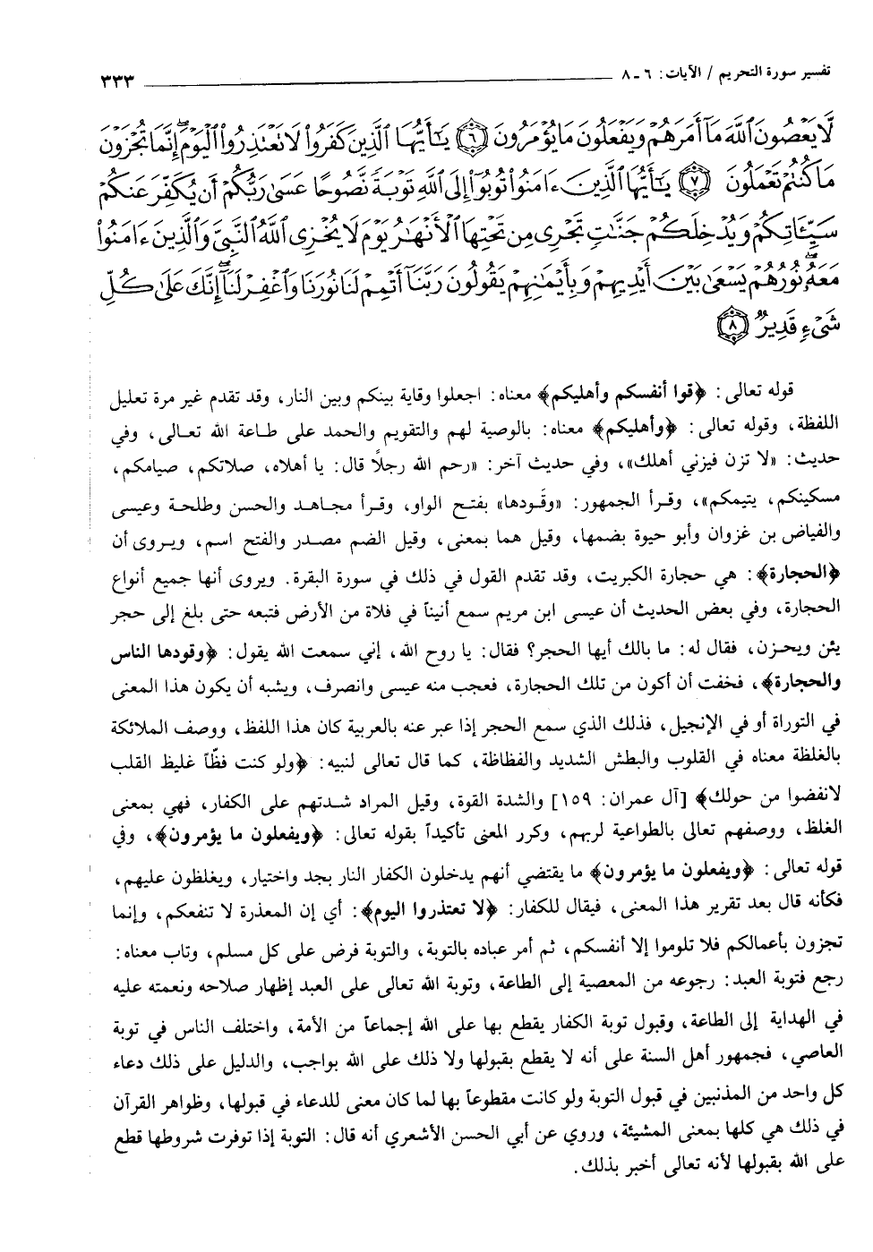 يا أَيُّهَا الَّذِينَ آمَنُوا قُوا أَنْفُسَكُمْ وَأَهْلِيكُمْ ناراً وَقُودُهَا النَّاسُ وَالْحِجارَةُ عَلَيْها مَلائِكَةٌ غِلاظٌ شِدادٌ لا يَعْصُونَ اللَّهَ ما أَمَرَهُمْ وَيَفْعَلُونَ ما يُؤْمَرُونَ (٦) يا أَيُّهَا الَّذِينَ كَفَرُوا لا تَعْتَذِرُوا الْيَوْمَ إِنَّما تُجْزَوْنَ ما كُنْتُمْ تَعْمَلُونَ (٧) يا أَيُّهَا الَّذِينَ آمَنُوا تُوبُوا إِلَى اللَّهِ تَوْبَةً نَصُوحاً عَسى رَبُّكُمْ أَنْ يُكَفِّرَ عَنْكُمْ سَيِّئاتِكُمْ وَيُدْخِلَكُمْ جَنَّاتٍ تَجْرِي مِنْ تَحْتِهَا الْأَنْهارُ يَوْمَ لا يُخْزِي اللَّهُ النَّبِيَّ وَالَّذِينَ آمَنُوا مَعَهُ نُورُهُمْ يَسْعى بَيْنَ أَيْدِيهِمْ وَبِأَيْمانِهِمْ يَقُولُونَ رَبَّنا أَتْمِمْ لَنا نُورَنا وَاغْفِرْ لَنا إِنَّكَ عَلى كُلِّ شَيْءٍ قَدِيرٌ (٨)