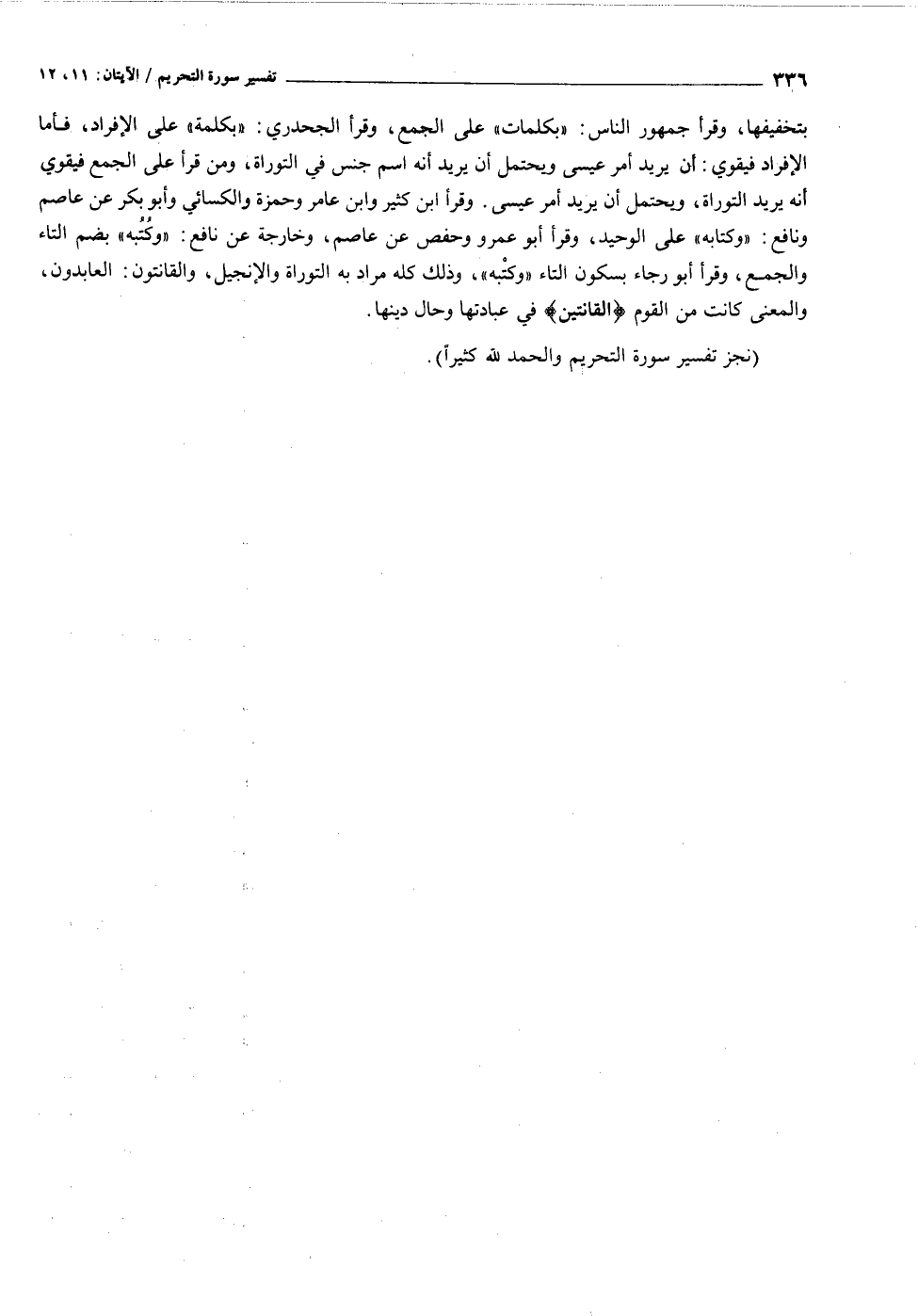 بتخفيفها، وقرأ جمهور الناس: «بكلمات» على الجمع، وقرأ الجحدري: «بكلمة» على الإفراد، فأما الإفراد فيقوي: أن يريد أمر عيسى ويحتمل أن يريد أنه اسم جنس في التوراة، ومن قرأ على الجمع فيقوي أنه يريد التوراة، ويحتمل أن يريد أمر عيسى. وقرأ ابن كثير وابن عامر وحمزة والكسائي وأبو بكر عن عاصم ونافع: «وكتابه» على الوحيد، وقرأ أبو عمرو وحفص عن عاصم، وخارجة عن نافع: «وكتبه» بضم التاء والجمع، وقرأ أبو رجاء بسكون التاء «وكتبه» ، وذلك كله مراد به التوراة والإنجيل، والقانتون: العابدون، والمعنى كانت من القوم الْقانِتِينَ في عبادتها وحال دينها.