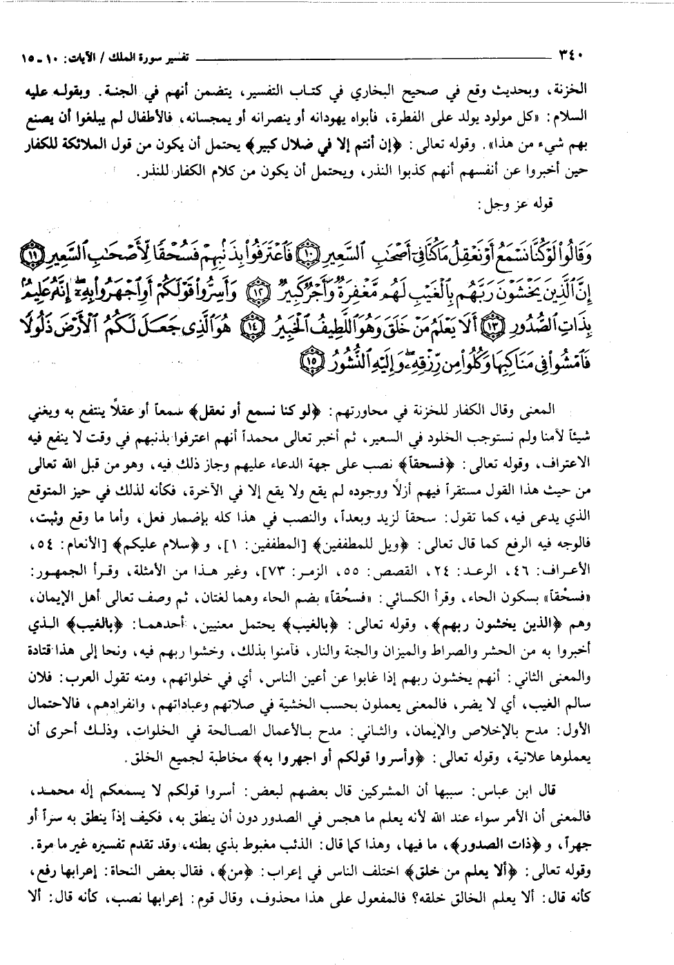 وَقالُوا لَوْ كُنَّا نَسْمَعُ أَوْ نَعْقِلُ ما كُنَّا فِي أَصْحابِ السَّعِيرِ (١٠) فَاعْتَرَفُوا بِذَنْبِهِمْ فَسُحْقاً لِأَصْحابِ السَّعِيرِ (١١) إِنَّ الَّذِينَ يَخْشَوْنَ رَبَّهُمْ بِالْغَيْبِ لَهُمْ مَغْفِرَةٌ وَأَجْرٌ كَبِيرٌ (١٢) وَأَسِرُّوا قَوْلَكُمْ أَوِ اجْهَرُوا بِهِ إِنَّهُ عَلِيمٌ بِذاتِ الصُّدُورِ (١٣) أَلا يَعْلَمُ مَنْ خَلَقَ وَهُوَ اللَّطِيفُ الْخَبِيرُ (١٤)