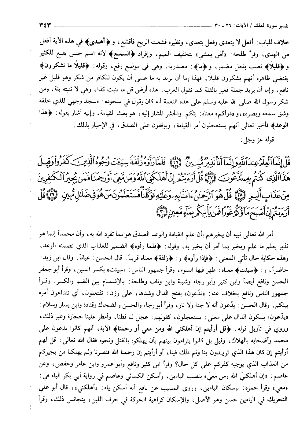 قُلْ إِنَّمَا الْعِلْمُ عِنْدَ اللَّهِ وَإِنَّما أَنَا نَذِيرٌ مُبِينٌ (٢٦) فَلَمَّا رَأَوْهُ زُلْفَةً سِيئَتْ وُجُوهُ الَّذِينَ كَفَرُوا وَقِيلَ هذَا الَّذِي كُنْتُمْ بِهِ تَدَّعُونَ (٢٧) قُلْ أَرَأَيْتُمْ إِنْ أَهْلَكَنِيَ اللَّهُ وَمَنْ مَعِيَ أَوْ رَحِمَنا فَمَنْ يُجِيرُ الْكافِرِينَ مِنْ عَذابٍ أَلِيمٍ (٢٨) قُلْ هُوَ الرَّحْمنُ آمَنَّا بِهِ وَعَلَيْهِ تَوَكَّلْنا فَسَتَعْلَمُونَ مَنْ هُوَ فِي ضَلالٍ مُبِينٍ (٢٩) قُلْ أَرَأَيْتُمْ إِنْ أَصْبَحَ ماؤُكُمْ غَوْراً فَمَنْ يَأْتِيكُمْ بِماءٍ مَعِينٍ (٣٠)