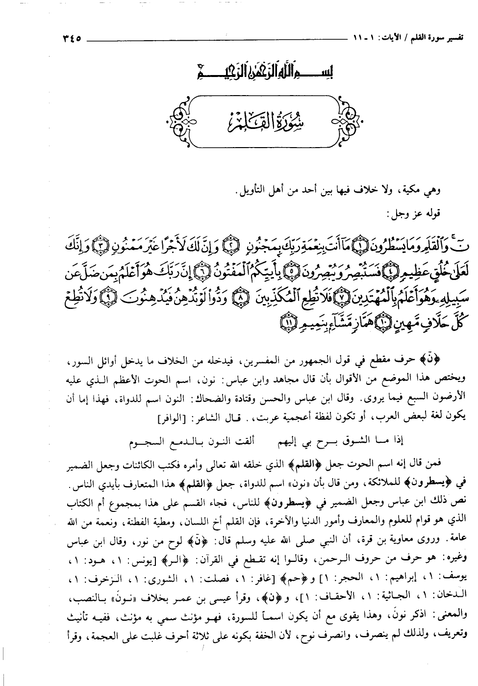 ن حرف مقطع في قول الجمهور من المفسرين، فيدخله من الخلاف ما يدخل أوائل السور، ويختص هذا الموضع من الأقوال بأن قال مجاهد وابن عباس: نون، اسم الحوت الأعظم الذي عليه الأرضون السبع فيما يروى. وقال ابن عباس والحسن وقتادة والضحاك: النون اسم للدواة، فهذا إما أن يكون لغة لبعض العرب، أو تكون لفظة أعجمية عربت، قال الشاعر: [الوافر]