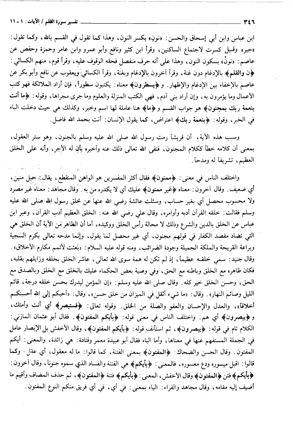 ن وَالْقَلَمِ بالإدغام دون غنة، وقرأ آخرون بالإدغام وبغنة، وقرأ الكسائي ويعقوب عن نافع وأبو بكر عن عاصم بالإخفاء بين الإدغام والإظهار. ويَسْطُرُونَ معناه: يكتبون سطورا، فإن أراد الملائكة فهو كتب الأعمال وما يؤمرون به، وإن أراد بني آدم، فهي الكتب المنزلة والعلوم وما جرى مجراها، وقوله: ما أَنْتَ بِنِعْمَةِ رَبِّكَ بِمَجْنُونٍ هو جواب القسم وما هنا عاملة لها اسم وخبر، وكذلك هي حيث دخلت الباء في الخبر، وقوله: بِنِعْمَةِ رَبِّكَ اعتراض، كما يقول الإنسان: أنت بحمد الله فاضل. وسبب هذه الآية، أن قريشا رمت رسول الله صلى الله عليه وسلم بالجنون، وهو ستر العقول، بمعنى أن كلامه خطأ ككلام المجنون، فنفى الله تعالى ذلك عنه وأخبره بأن له الأجر، وأنه على الخلق العظيم، تشريفا له ومدحا.