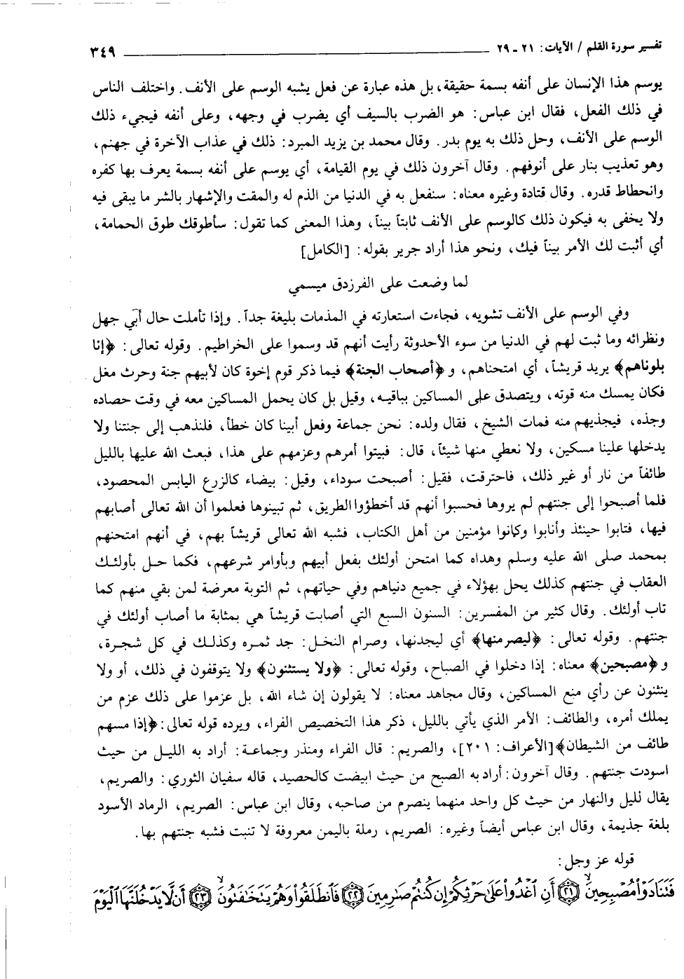 يوسم هذا الإنسان على أنفه بسمة حقيقة، بل هذه عبارة عن فعل يشبه الوسم على الأنف. واختلف الناس في ذلك الفعل، فقال ابن عباس: هو الضرب بالسيف أي يضرب في وجهه، وعلى أنفه فيجيء ذلك الوسم على الأنف، وحل ذلك به يوم بدر. وقال محمد بن يزيد المبرد: ذلك في عذاب الآخرة في جهنم، وهو تعذيب بنار على أنوفهم. وقال آخرون ذلك في يوم القيامة، أي يوسم على أنفه بسمة يعرف بها كفره وانحطاط قدره. وقال قتادة وغيره معناه: سنفعل به في الدنيا من الذم له والمقت والإشهار بالشر ما يبقى فيه ولا يخفى به فيكون ذلك كالوسم على الأنف ثابتا بينا، وهذا المعنى كما تقول: سأطوقك طوق الحمامة، أي أثبت لك الأمر بينا فيك، ونحو هذا أراد جرير بقوله: [الكامل] لما وضعت على الفرزدق ميسمي وفي الوسم على الأنف تشويه، فجاءت استعارته في المذمات بليغة جدا. وإذا تأملت حال أبي جهل ونظرائه وما ثبت لهم في الدنيا من سوء الأحدوثة رأيت أنهم قد وسموا على الخراطيم. وقوله تعالى: إِنَّا بَلَوْناهُمْ يريد قريشا، أي امتحناهم، وأَصْحابَ الْجَنَّةِ فيما ذكر قوم إخوة كان لأبيهم جنة وحرث مغل فكان يمسك منه قوته، ويتصدق على المساكين بباقيه، وقيل بل كان يحمل المساكين معه في وقت حصاده وجذه، فيجذيهم منه فمات الشيخ، فقال ولده: نحن جماعة وفعل أبينا كان خطأ، فلنذهب إلى جنتنا ولا يدخلها علينا مسكين، ولا نعطي منها شيئا، قال: فبيتوا أمرهم وعزمهم على هذا، فبعث الله عليها بالليل طائفا من نار أو غير ذلك، فاحترقت، فقيل: أصبحت سوداء، وقيل: بيضاء كالزرع اليابس المحصود، فلما أصبحوا إلى جنتهم لم يروها فحسبوا أنهم قد أخطؤوا الطريق، ثم تبينوها فعلموا أن الله تعالى أصابهم فيها، فتابوا حينئذ وأنابوا وكانوا مؤمنين من أهل الكتاب، فشبه الله تعالى قريشا بهم، في أنهم امتحنهم بمحمد صلى الله عليه وسلم وهداه كما امتحن أولئك بفعل أبيهم وبأوامر شرعهم، فكما حل بأولئك العقاب في جنتهم كذلك يحل بهؤلاء في جميع دنياهم وفي حياتهم، ثم التوبة معرضة لمن بقي منهم كما تاب أولئك. وقال كثير من المفسرين: السنون السبع التي أصابت قريشا هي بمثابة ما أصاب أولئك في جنتهم. وقوله تعالى: لَيَصْرِمُنَّها أي ليجدنها، وصرام النخل: جد ثمره وكذلك في كل شجرة، ومُصْبِحِينَ معناه: إذا دخلوا في الصباح، وقوله تعالى: وَلا يَسْتَثْنُونَ ولا يتوقفون في ذلك، أو ولا ينثنون عن رأي منع المساكين، وقال مجاهد معناه: لا يقولون إن شاء الله، بل عزموا على ذلك عزم من يملك أمره، والطائف: الأمر الذي يأتي بالليل، ذكر هذا التخصيص الفراء، ويرده قوله تعالى: إِذا مَسَّهُمْ طائِفٌ مِنَ الشَّيْطانِ [الأعراف: ٢٠١] ، والصريم: قال الفراء ومنذر وجماعة: أراد به الليل من حيث اسودت جنتهم. وقال آخرون: أراد به الصبح من حيث ابيضت كالحصيد، قاله سفيان الثوري: والصريم، يقال لليل والنهار من حيث كل واحد منهما ينصرم من صاحبه، وقال ابن عباس: الصريم، الرماد الأسود بلغة جذيمة، وقال ابن عباس أيضا وغيره: الصريم، رملة باليمن معروفة لا تنبت فشبه جنتهم بها.