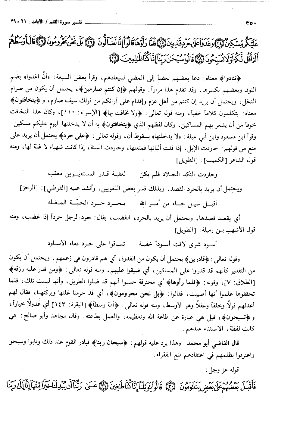 وقوله تعالى: قادِرِينَ يحتمل أن يكون من القدرة، أي هم قادرون في زعمهم، ويحتمل أن يكون من التقدير كأنهم قد قدروا على المساكين، أي ضيقوا عليهم، ومنه قوله تعالى: وَمَنْ قُدِرَ عَلَيْهِ رِزْقُهُ [الطلاق: ٧] ، وقوله: فَلَمَّا رَأَوْها أي محترقة حسبوا أنهم قد ضلوا الطريق، وأنها ليست تلك، فلما تحققوها علموا أنها أصيبت، فقالوا: بَلْ نَحْنُ مَحْرُومُونَ، أي قد حرمنا غلتها وبركتها، فقال لهم أعدلهم قولا وخلقا وعقلا وهو الأوسط، ومنه قوله تعالى: أُمَّةً وَسَطاً [البقرة: ١٤٣] أي عدولا خيارا، وتُسَبِّحُونَ، قيل هي عبارة عن طاعة الله وتعظيمه، والعمل بطاعته. وقال مجاهد وأبو صالح: هي كانت لفظة، الاستثناء عندهم.
