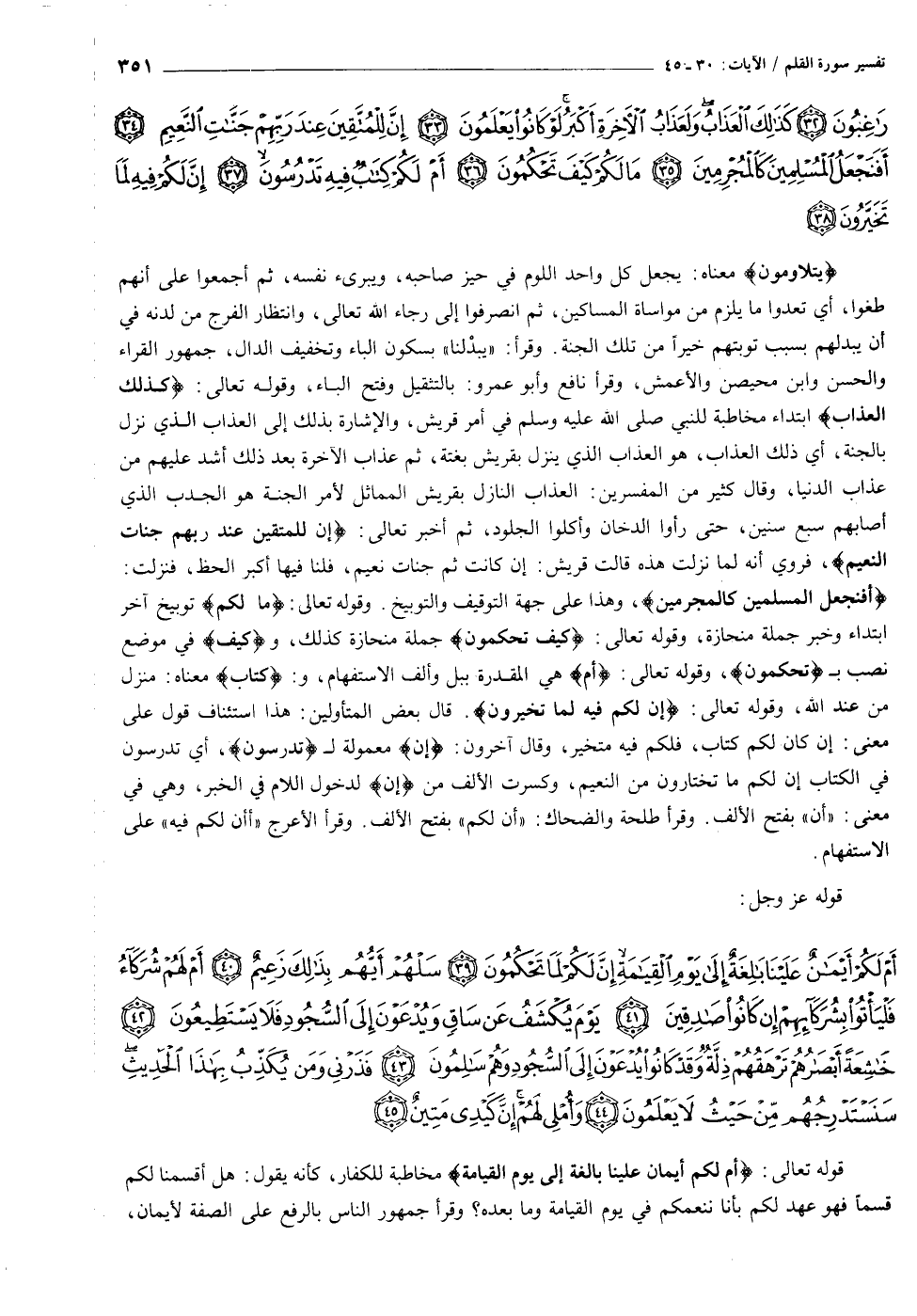 أَفَنَجْعَلُ الْمُسْلِمِينَ كَالْمُجْرِمِينَ، وهذا على جهة التوقيف والتوبيخ. وقوله تعالى: ما لَكُمْ توبيخ آخر ابتداء وخبر جملة منحازة، وقوله تعالى: كَيْفَ تَحْكُمُونَ جملة منحازة كذلك، وكَيْفَ في موضع نصب ب تَحْكُمُونَ، وقوله تعالى: أَمْ هي المقدرة ببل وألف الاستفهام، و: كِتابٌ معناه: منزل من عند الله، وقوله تعالى: إِنَّ لَكُمْ فِيهِ لَما تَخَيَّرُونَ. قال بعض المتأولين: هذا استئناف قول على معنى: إن كان لكم كتاب، فلكم فيه متخير، وقال آخرون: إِنَّ معمولة ل تَدْرُسُونَ، أي تدرسون في الكتاب إن لكم ما تختارون من النعيم، وكسرت الألف من إِنَّ لدخول اللام في الخبر، وهي في معنى: «أن» بفتح الألف. وقرأ طلحة والضحاك: «أن لكم» بفتح الألف. وقرأ الأعرج «أأن لكم فيه» على الاستفهام.