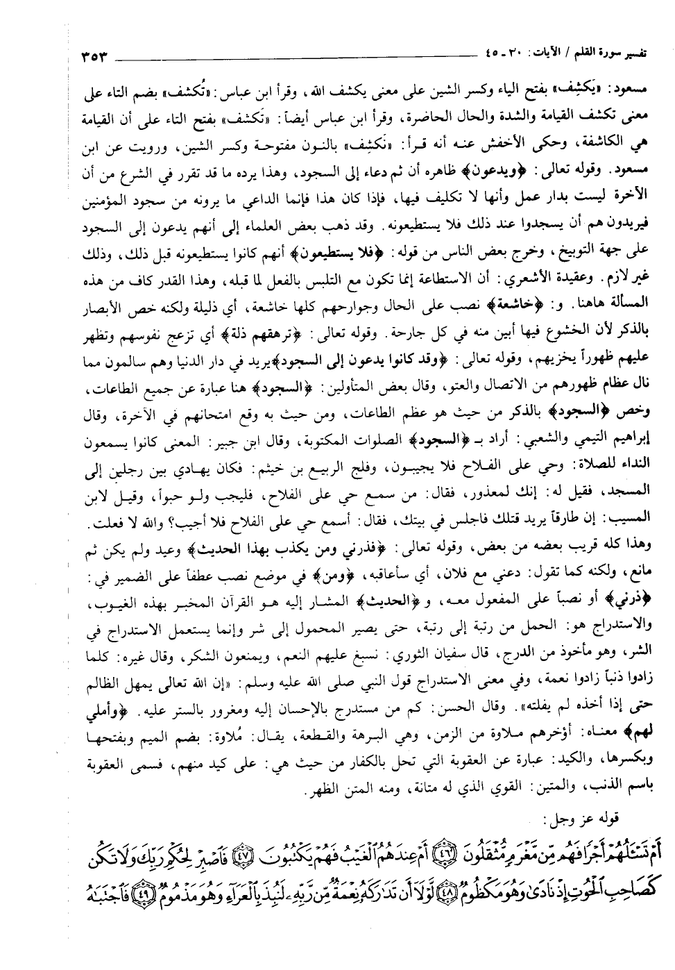 مسعود: «يكشف» بفتح الياء وكسر الشين على معنى يكشف الله، وقرأ ابن عباس: «تكشف» بضم التاء على معنى تكشف القيامة والشدة والحال الحاضرة، وقرأ ابن عباس أيضا: «تكشف» بفتح التاء على أن القيامة هي الكاشفة، وحكى الأخفش عنه أنه قرأ: «نكشف» بالنون مفتوحة وكسر الشين، ورويت عن ابن مسعود. وقوله تعالى: وَيُدْعَوْنَ ظاهره أن ثم دعاء إلى السجود، وهذا يرده ما قد تقرر في الشرع من أن الآخرة ليست بدار عمل وأنها لا تكليف فيها، فإذا كان هذا فإنما الداعي ما يرونه من سجود المؤمنين فيريدون هم أن يسجدوا عند ذلك فلا يستطيعونه. وقد ذهب بعض العلماء إلى أنهم يدعون إلى السجود على جهة التوبيخ، وخرج بعض الناس من قوله: فَلا يَسْتَطِيعُونَ أنهم كانوا يستطيعونه قبل ذلك، وذلك غير لازم. وعقيدة الأشعري: أن الاستطاعة إنما تكون مع التلبس بالفعل لما قبله، وهذا القدر كاف من هذه المسألة هاهنا. و: خاشِعَةً نصب على الحال وجوارحهم كلها خاشعة، أي ذليلة ولكنه خص الأبصار بالذكر لأن الخشوع فيها أبين منه في كل جارحة. وقوله تعالى: تَرْهَقُهُمْ ذِلَّةٌ أي تزعج نفوسهم وتظهر عليهم ظهورا يخزيهم، وقوله تعالى: وَقَدْ كانُوا يُدْعَوْنَ إِلَى السُّجُودِ يريد في دار الدنيا وهم سالمون مما نال عظام ظهورهم من الاتصال والعتو، وقال بعض المتأولين: «السجود» هنا عبارة عن جميع الطاعات، وخص «السجود» بالذكر من حيث هو عظم الطاعات، ومن حيث به وقع امتحانهم في الآخرة، وقال إبراهيم التيمي والشعبي: أراد ب السُّجُودِ الصلوات المكتوبة، وقال ابن جبير: المعنى كانوا يسمعون النداء للصلاة: وحي على الفلاح فلا يجيبون، وفلج الربيع بن خيثم: فكان يهادي بين رجلين إلى المسجد، فقيل له: إنك لمعذور، فقال: من سمع حي على الفلاح، فليجب ولو حبوا، وقيل لابن المسيب: إن طارقا يريد قتلك فاجلس في بيتك، فقال: أسمع حي على الفلاح فلا أجيب؟ والله لا فعلت.