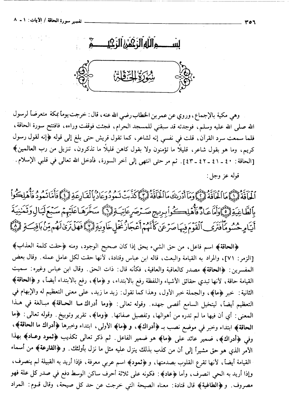 وهي مكية بالإجماع، وروي عن عمر بن الخطاب رضي الله عنه، قال: خرجت يوما بمكة متعرضا لرسول الله صلى الله عليه وسلم، فوجدته قد سبقني للمسجد الحرام، فجئت فوقفت وراءه، فافتتح سورة الحاقة، فلما سمعت سرد القرآن، قلت في نفسي إنه لشاعر، كما تقول قريش حتى بلغ إلى قوله إِنَّهُ لَقَوْلُ رَسُولٍ كَرِيمٍ، وَما هُوَ بِقَوْلِ شاعِرٍ، قَلِيلًا ما تُؤْمِنُونَ وَلا بِقَوْلِ كاهِنٍ قَلِيلًا ما تَذَكَّرُونَ، تَنْزِيلٌ مِنْ رَبِّ الْعالَمِينَ [الحاقة: ٤٠- ٤١- ٤٢- ٤٣] . ثم مر حتى انتهى إلى آخر السورة، فأدخل الله تعالى في قلبي الإسلام.
