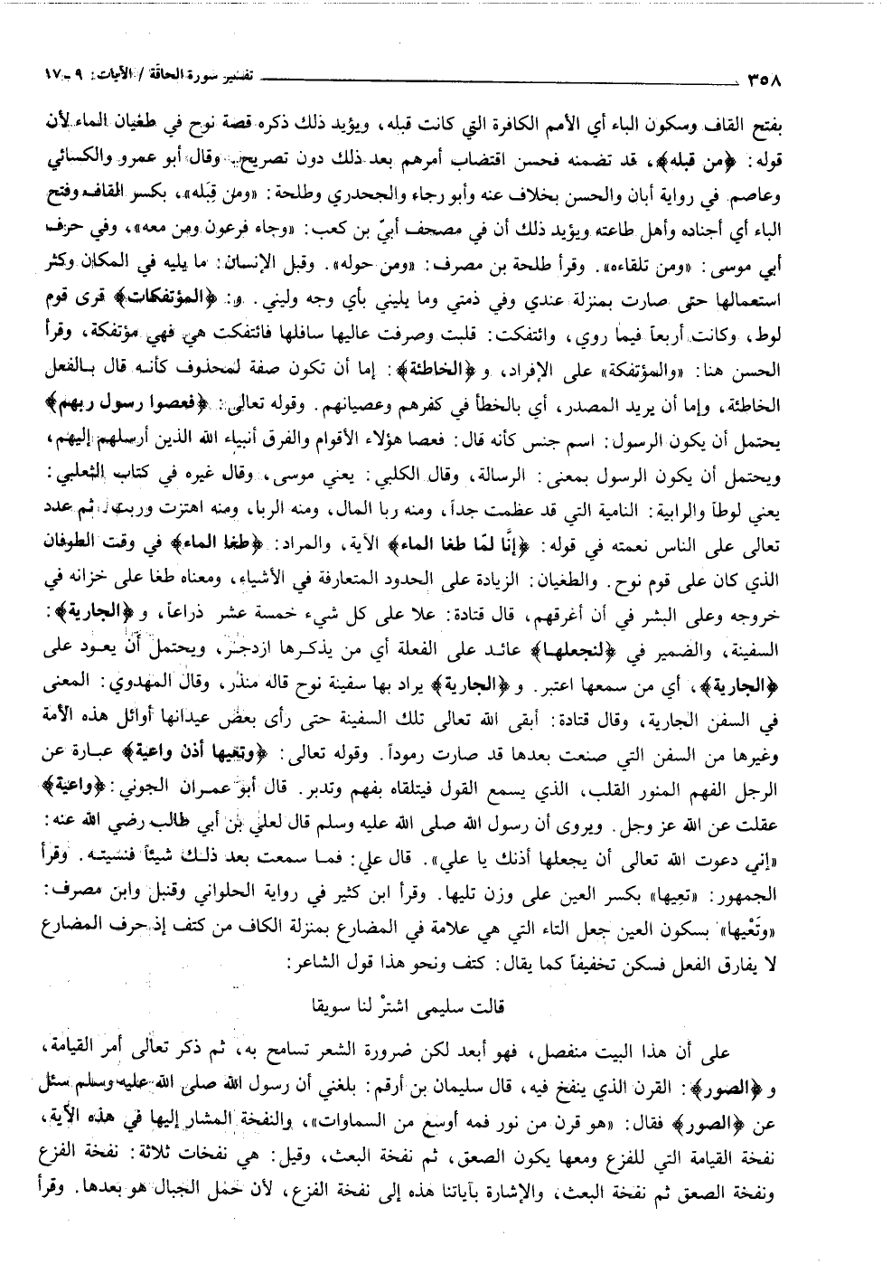 قالت سليمى اشتر لنا سويقا على أن هذا البيت منفصل، فهو أبعد لكن ضرورة الشعر تسامح به، ثم ذكر تعالى أمر القيامة، و «الصور» : القرن الذي ينفخ فيه، قال سليمان بن أرقم: بلغني أن رسول الله صلى الله عليه وسلم سئل عن الصُّورِ فقال: «هو قرن من نور فمه أوسع من السماوات» ، والنفخة المشار إليها في هذه الآية، نفخة القيامة التي للفزع ومعها يكون الصعق، ثم نفخة البعث، وقيل: هي نفخات ثلاثة: نفخة الفزع ونفخة الصعق ثم نفخة البعث، والإشارة بآياتنا هذه إلى نفخة الفزع، لأن حمل الجبال هو بعدها. وقرأ