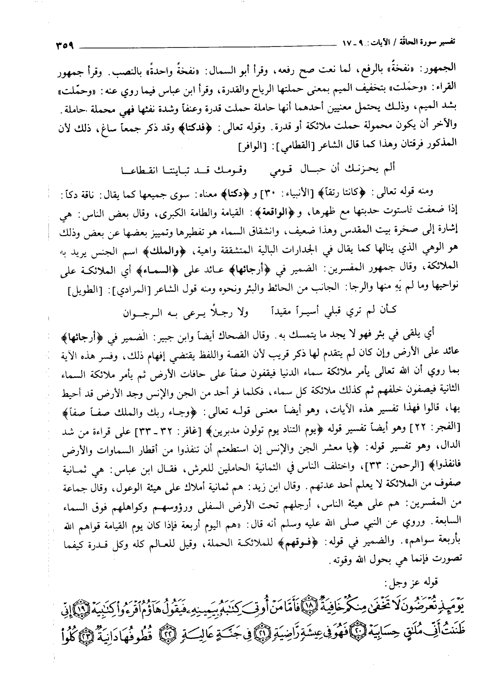 أي يلقى في بئر فهو لا يجد ما يتمسك به. وقال الضحاك أيضا وابن جبير: الضمير في أَرْجائِها عائد على الأرض وإن كان لم يتقدم لها ذكر قريب لأن القصة واللفظ يقتضي إفهام ذلك، وفسر هذه الآية بما روي أن الله تعالى يأمر ملائكة سماء الدنيا فيقفون صفا على حافات الأرض ثم يأمر ملائكة السماء الثانية فيصفون خلفهم ثم كذلك ملائكة كل سماء، فكلما فر أحد من الجن والإنس وجد الأرض قد أحيط بها، قالوا فهذا تفسير هذه الآيات، وهو أيضا معنى قوله تعالى: وَجاءَ رَبُّكَ وَالْمَلَكُ صَفًّا صَفًّا [الفجر: ٢٢] وهو أيضا تفسير قوله يَوْمَ التَّنادِ يَوْمَ تُوَلُّونَ مُدْبِرِينَ [غافر: ٣٢- ٣٣] على قراءة من شد الدال، وهو تفسير قوله: يا مَعْشَرَ الْجِنِّ وَالْإِنْسِ إِنِ اسْتَطَعْتُمْ أَنْ تَنْفُذُوا مِنْ أَقْطارِ السَّماواتِ وَالْأَرْضِ فَانْفُذُوا [الرحمن: ٣٣] ، واختلف الناس في الثمانية الحاملين للعرش، فقال ابن عباس: هي ثمانية صفوف من الملائكة لا يعلم أحد عدتهم. وقال ابن زيد: هم ثمانية أملاك على هيئة الوعول، وقال جماعة من المفسرين: هم على هيئة الناس، أرجلهم تحت الأرض السفلى ورؤوسهم وكواهلهم فوق السماء السابعة. وروي عن النبي صلى الله عليه وسلم أنه قال: «هم اليوم أربعة فإذا كان يوم القيامة قواهم الله بأربعة سواهم» . والضمير في قوله: فَوْقَهُمْ للملائكة الحملة، وقيل للعالم كله وكل قدرة كيفما تصورت فإنما هي بحول الله وقوته.