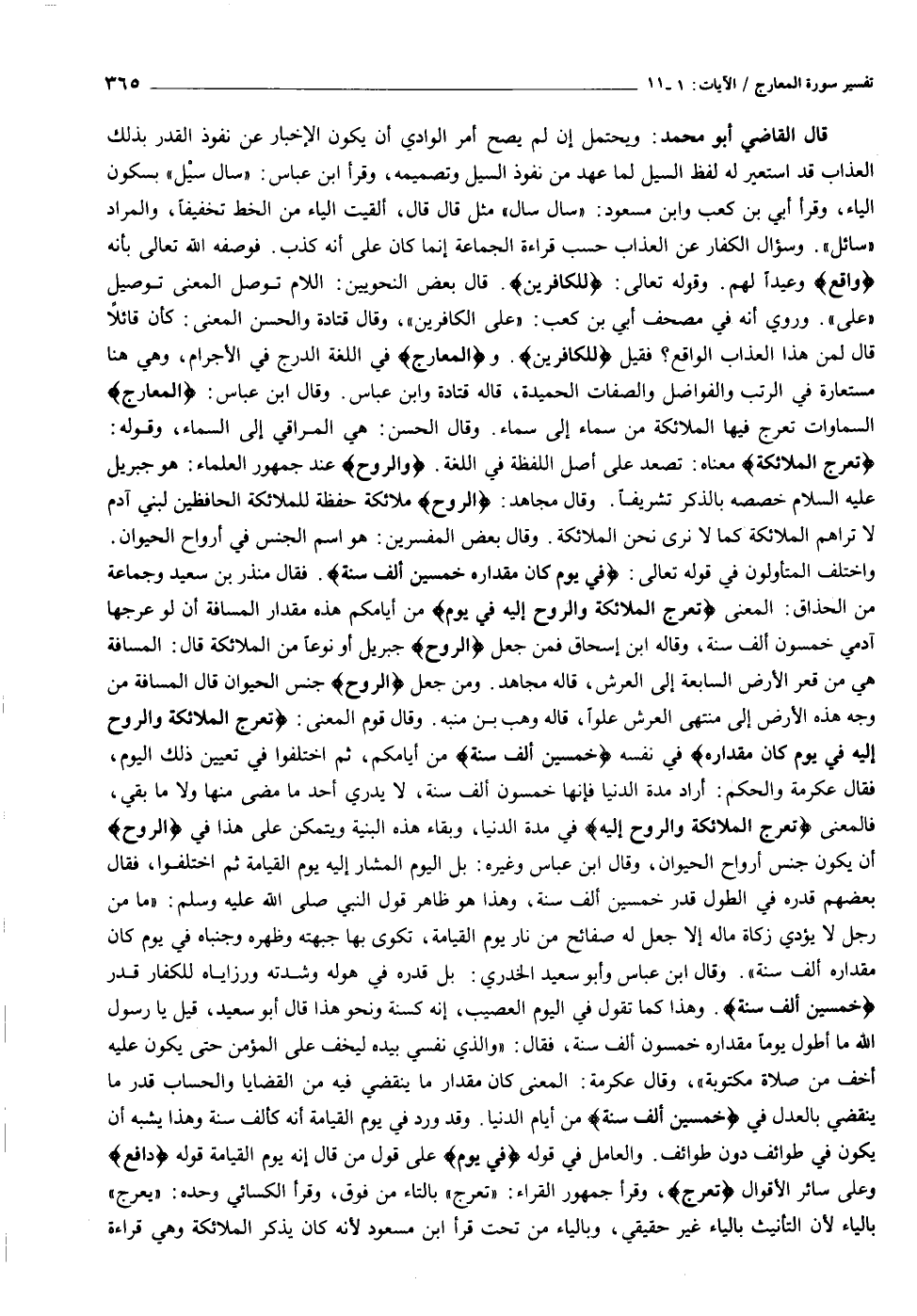 واختلف المتأولون في قوله تعالى: فِي يَوْمٍ كانَ مِقْدارُهُ خَمْسِينَ أَلْفَ سَنَةٍ. فقال منذر بن سعيد وجماعة من الحذاق: المعنى تَعْرُجُ الْمَلائِكَةُ وَالرُّوحُ إِلَيْهِ فِي يَوْمٍ من أيامكم هذه مقدار المسافة أن لو عرجها آدمي خمسون ألف سنة، وقاله ابن إسحاق فمن جعل «الروح» جبريل أو نوعا من الملائكة قال: المسافة هي من قعر الأرض السابعة إلى العرش، قاله مجاهد. ومن جعل «الروح» جنس الحيوان قال المسافة من وجه هذه الأرض إلى منتهى العرش علوا، قاله وهب بن منبه. وقال قوم المعنى: تَعْرُجُ الْمَلائِكَةُ وَالرُّوحُ إِلَيْهِ فِي يَوْمٍ كانَ مِقْدارُهُ في نفسه خَمْسِينَ أَلْفَ سَنَةٍ من أيامكم، ثم اختلفوا في تعيين ذلك اليوم، فقال عكرمة والحكم: أراد مدة الدنيا فإنها خمسون ألف سنة، لا يدري أحد ما مضى منها ولا ما بقي، فالمعنى تَعْرُجُ الْمَلائِكَةُ وَالرُّوحُ إِلَيْهِ في مدة الدنيا، وبقاء هذه البنية ويتمكن على هذا في «الروح» أن يكون جنس أرواح الحيوان، وقال ابن عباس وغيره: بل اليوم المشار إليه يوم القيامة ثم اختلفوا، فقال بعضهم قدره في الطول قدر خمسين ألف سنة، وهذا هو ظاهر قول النبي صلى الله عليه وسلم: «ما من رجل لا يؤدي زكاة ماله إلا جعل له صفائح من نار يوم القيامة، تكوى بها جبهته وظهره وجنباه في يوم كان مقداره ألف سنة» . وقال ابن عباس وأبو سعيد الخدري: بل قدره في هوله وشدته ورزاياه للكفار قدر خَمْسِينَ أَلْفَ سَنَةٍ. وهذا كما تقول في اليوم العصيب، إنه كسنة ونحو هذا قال أبو سعيد، قيل يا رسول الله ما أطول يوما مقداره خمسون ألف سنة، فقال: «والذي نفسي بيده ليخف على المؤمن حتى يكون عليه أخف من صلاة مكتوبة» ، وقال عكرمة: المعنى كان مقدار ما ينقضي فيه من القضايا والحساب قدر ما ينقضي بالعدل في خَمْسِينَ أَلْفَ سَنَةٍ من أيام الدنيا. وقد ورد في يوم القيامة أنه كألف سنة وهذا يشبه أن يكون في طوائف دون طوائف. والعامل في قوله فِي يَوْمٍ على قول من قال إنه يوم القيامة قوله دافِعٌ وعلى سائر الأقوال تَعْرُجُ، وقرأ جمهور القراء: «تعرج» بالتاء من فوق، وقرأ الكسائي وحده: «يعرج» بالياء لأن التأنيث بالياء غير حقيقي، وبالياء من تحت قرأ ابن مسعود لأنه كان يذكر الملائكة وهي قراءة