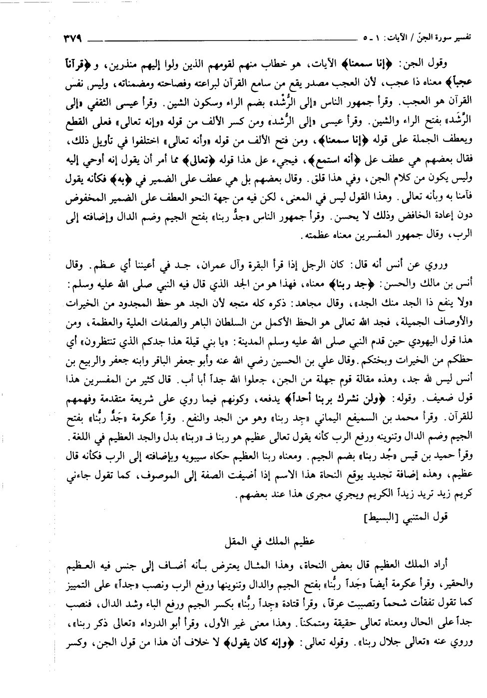 قول المتنبي [البسيط] عظيم الملك في المقل أراد الملك العظيم قال بعض النحاة، وهذا المثال يعترض بأنه أضاف إلى جنس فيه العظيم والحقير، وقرأ عكرمة أيضا «جدا ربّنا» بفتح الجيم والدال وتنوينها ورفع الرب ونصب «جدا» على التمييز كما تقول تفقأت شحما وتصببت عرقا، وقرأ قتادة «جدا ربّنا» بكسر الجيم ورفع الباء وشد الدال، فنصب جدا على الحال ومعناه تعالى حقيقة ومتمكنا. وهذا معنى غير الأول، وقرأ أبو الدرداء «تعالى ذكر ربنا» ، وروي عنه «تعالى جلال ربنا» . وقوله تعالى: وَأَنَّهُ كانَ يَقُولُ لا خلاف أن هذا من قول الجن، وكسر